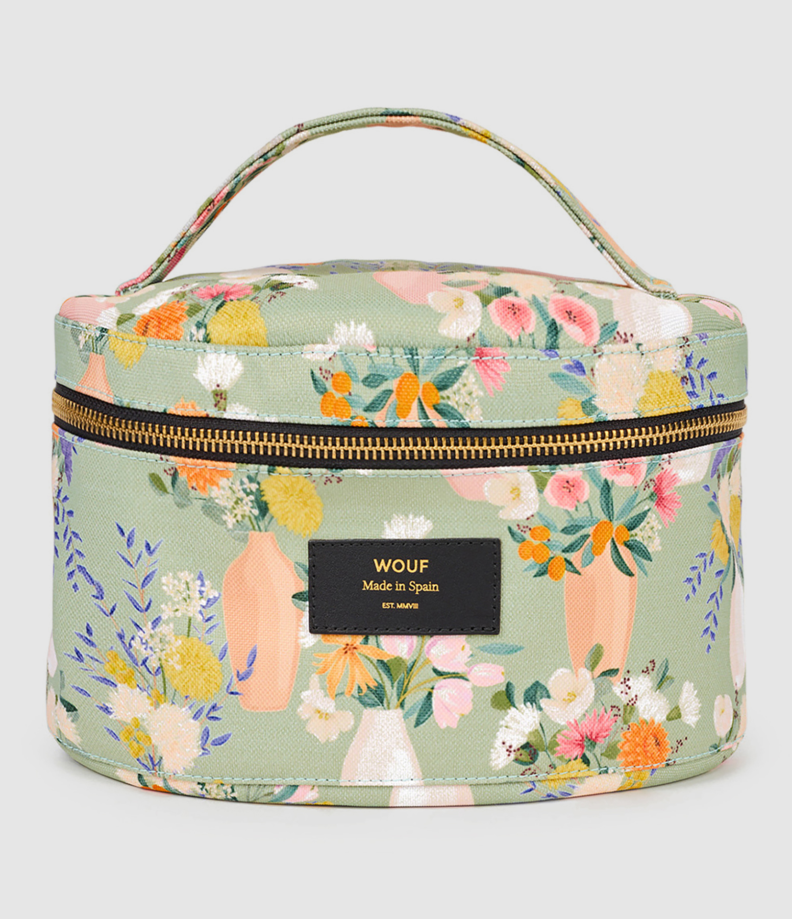 Trousse ronde en toile recyclée, imprimé bouquets pastels. Poignée sur le dessus. Fermeture glissière YKK recyclée. Résistante à l'eau. Encres écologiques.