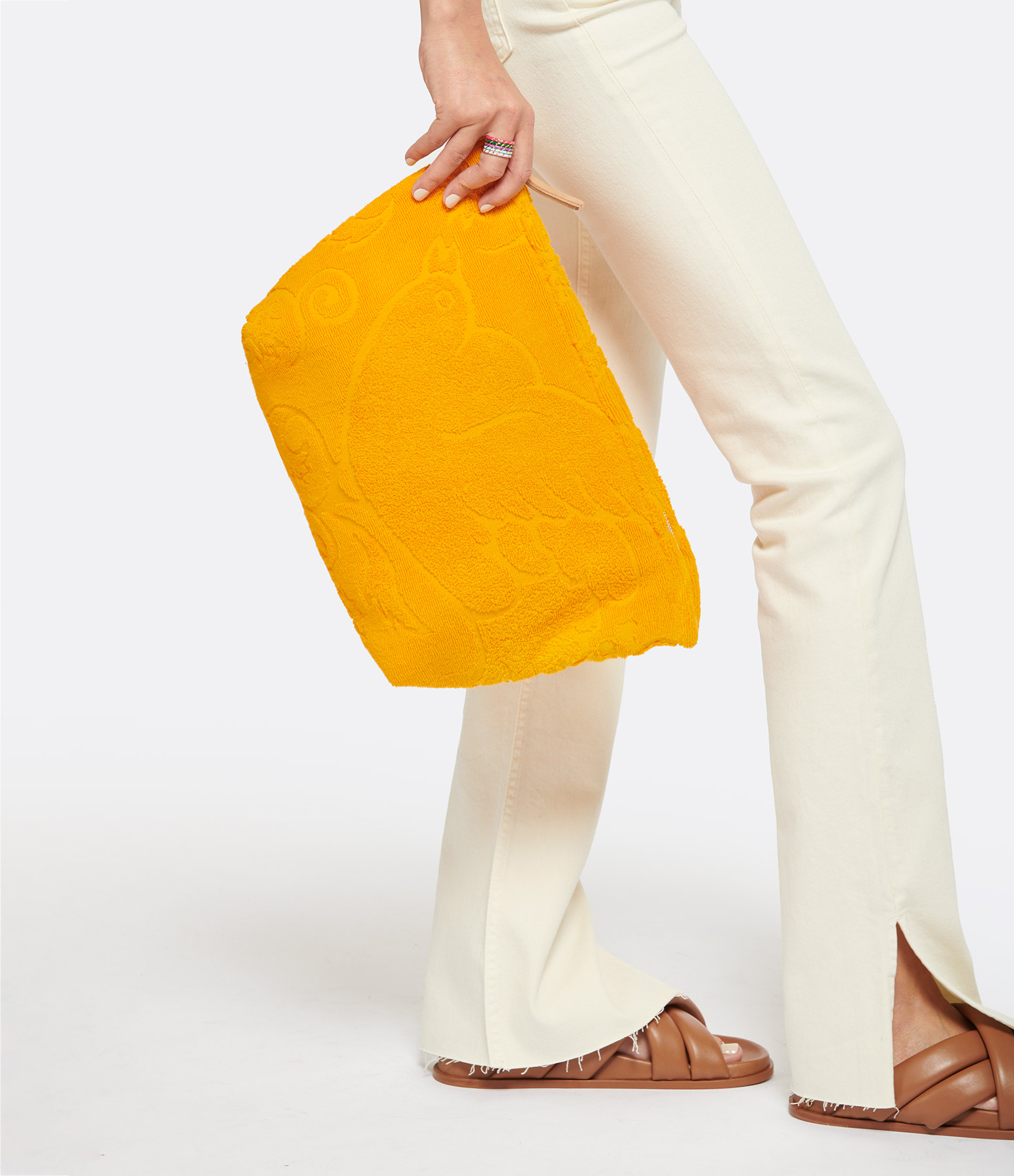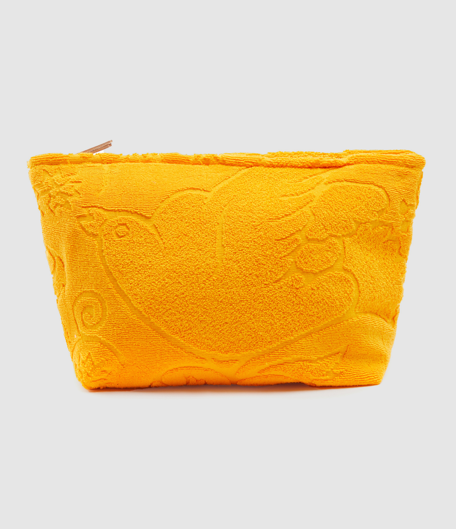 Trousse en serviette éponge orange à motifs texturés. Fermeture par un zip avec languette en cuir. Intérieur doublé en tissu à imprimé wax (motifs africains).