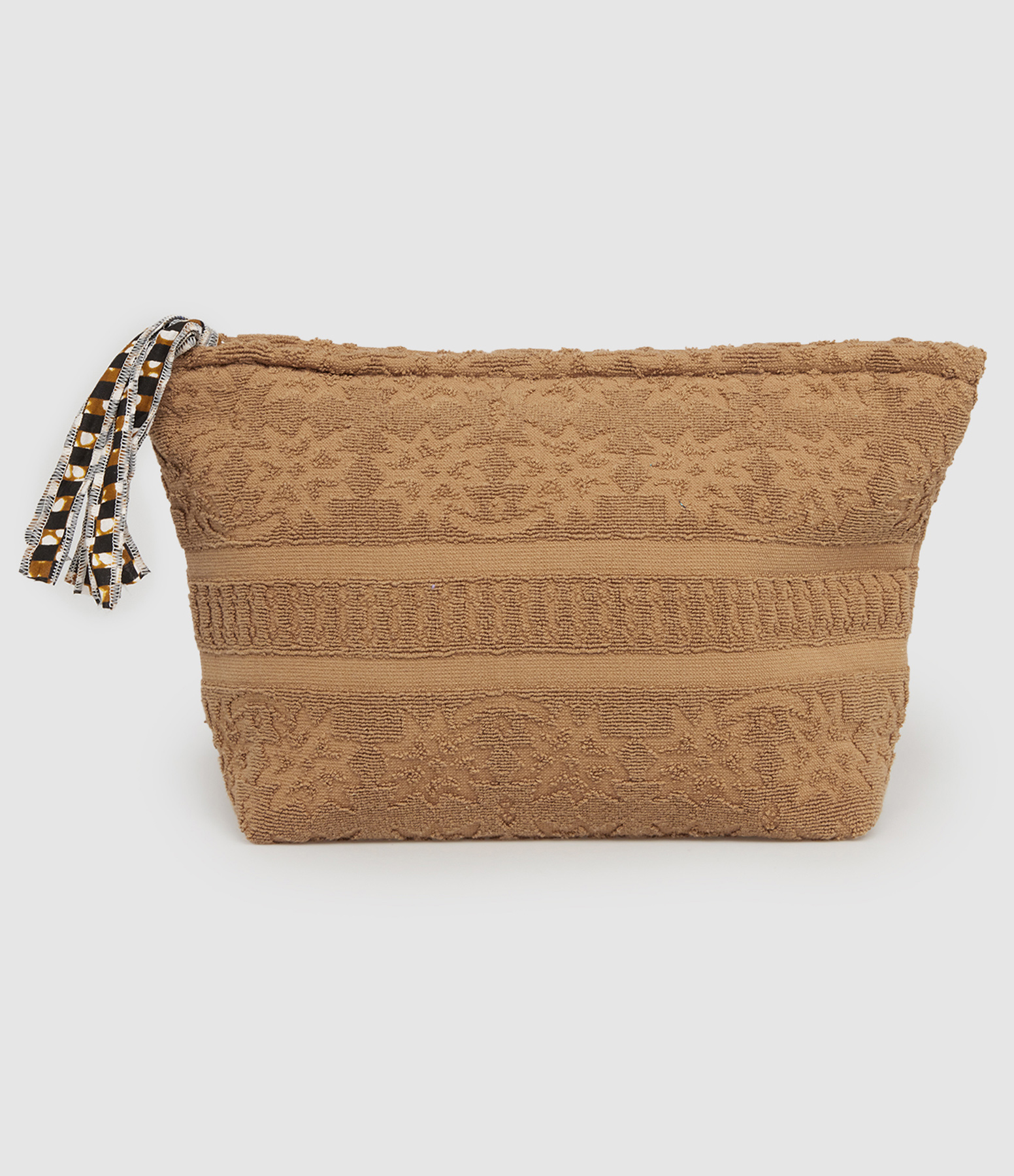Grande trousse en serviette éponge marron à motifs texturés. Fermeture par un zip. Intérieur doublé en tissu à imprimé wax (motifs africains).
