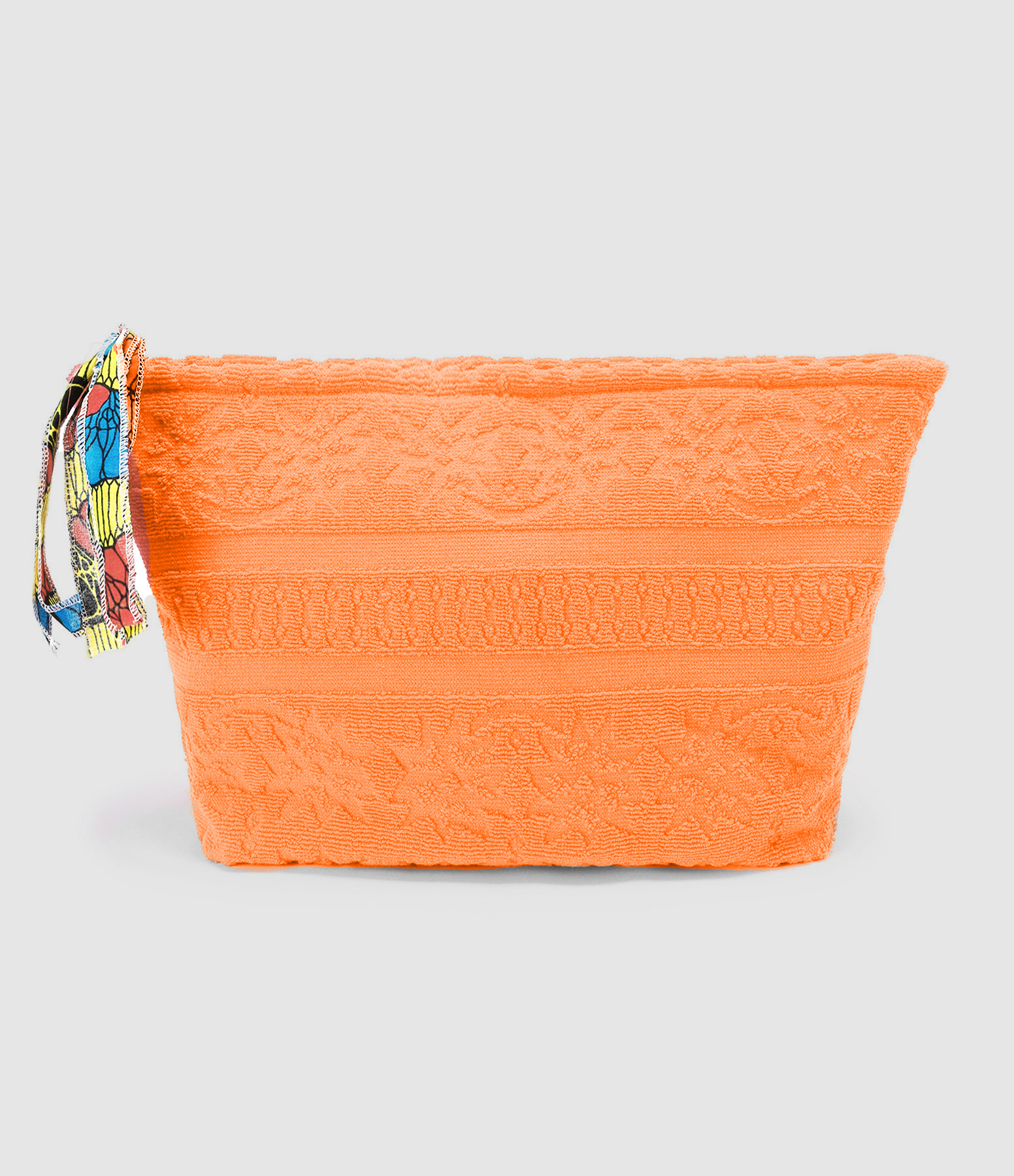 Grande trousse en serviette éponge orange à motifs texturés. Fermeture par un zip. Intérieur doublé en tissu à imprimé wax (motifs africains).