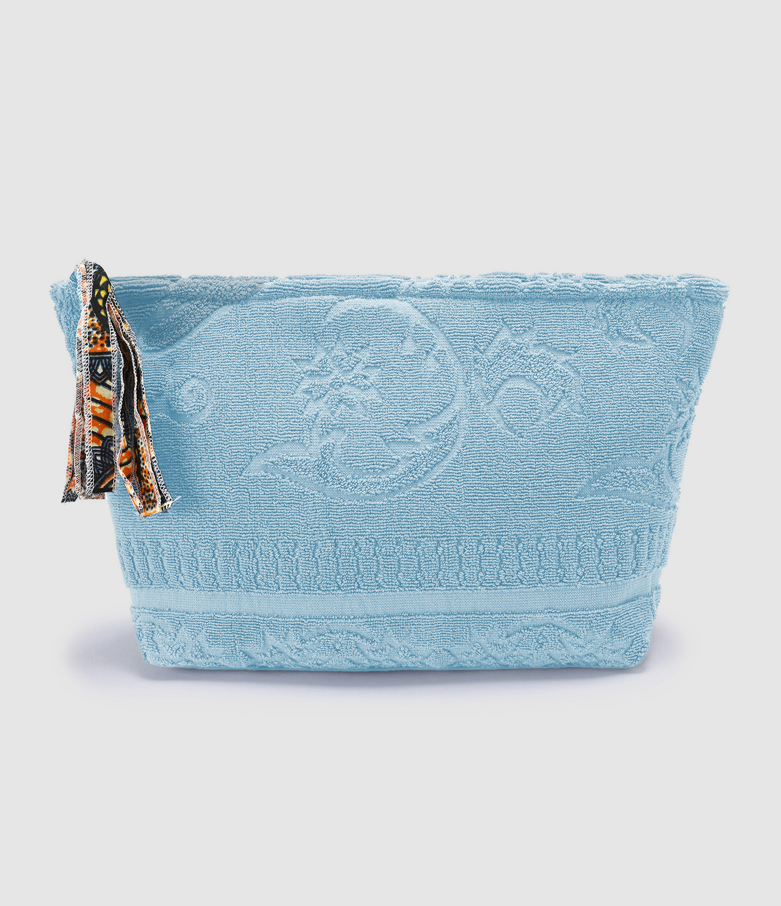 Grande trousse en serviette éponge bleue à motifs texturés. Fermeture par un zip. Intérieur doublé en tissu à imprimé wax (motifs africains).
