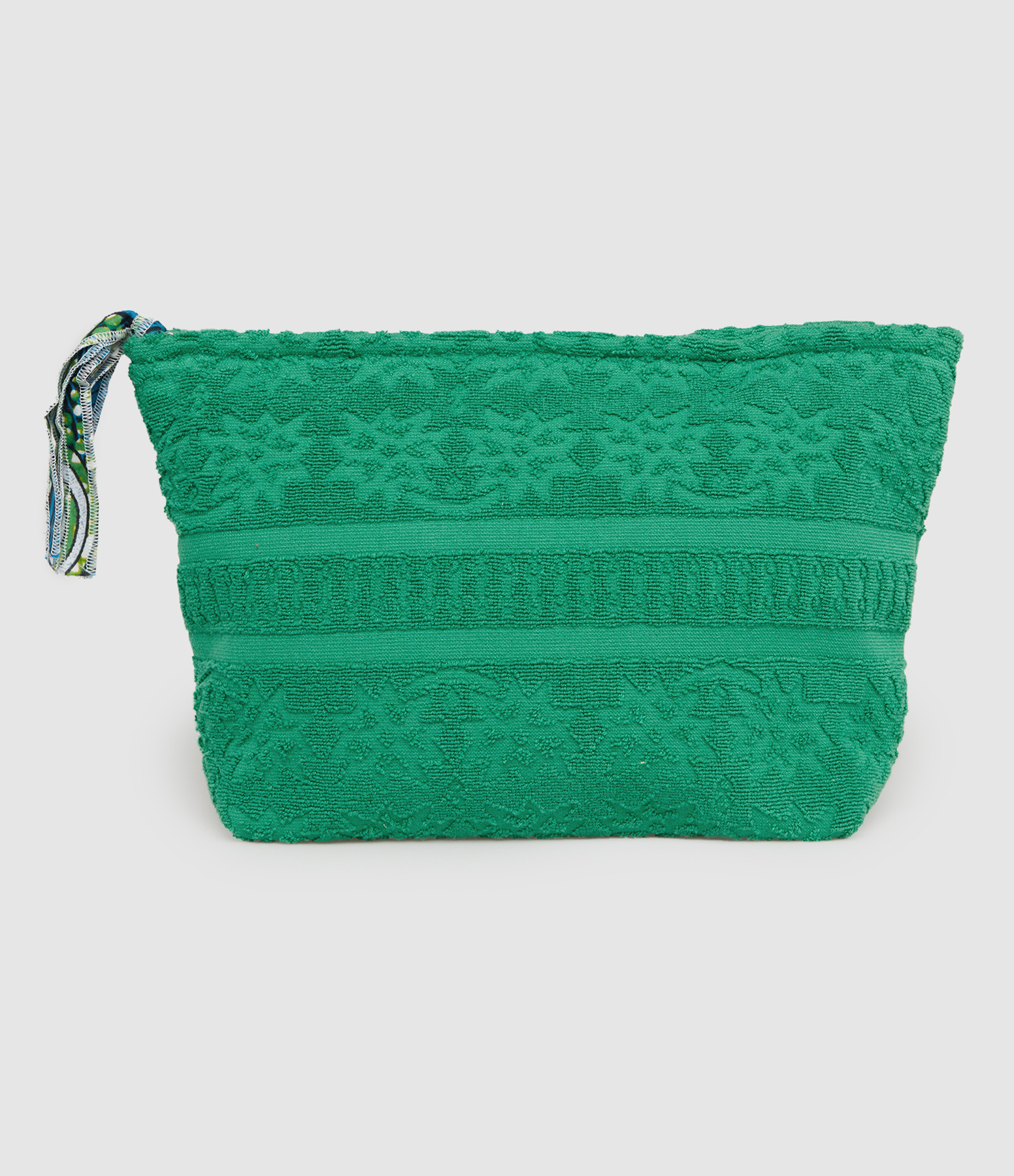 Grande trousse en serviette éponge vert à motifs texturés. Fermeture par un zip. Intérieur doublé en tissu à imprimé wax (motifs africains).