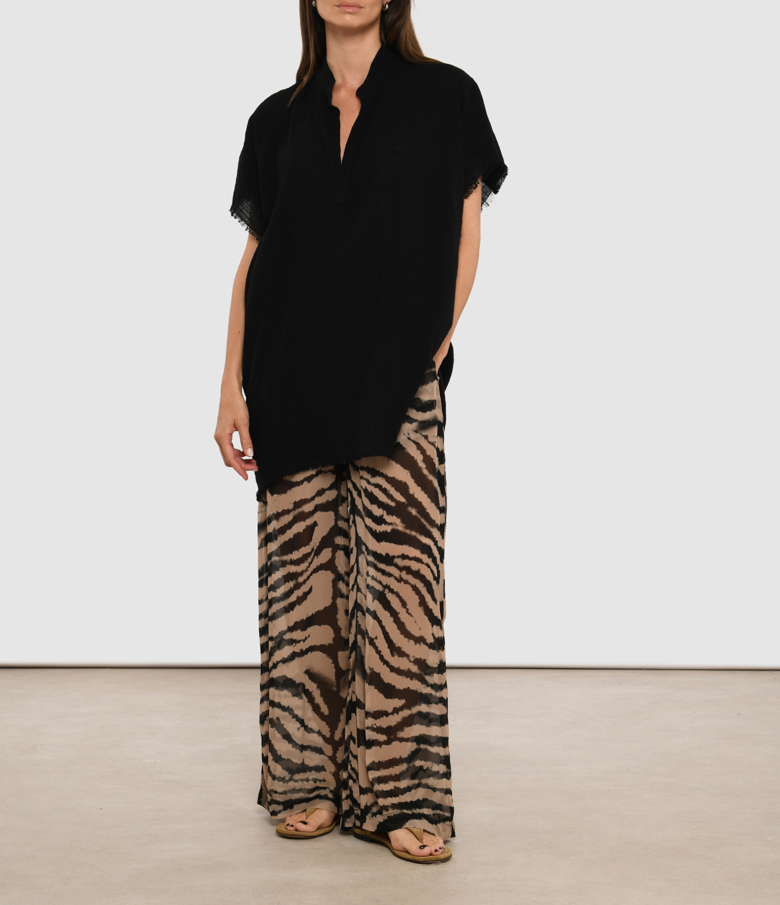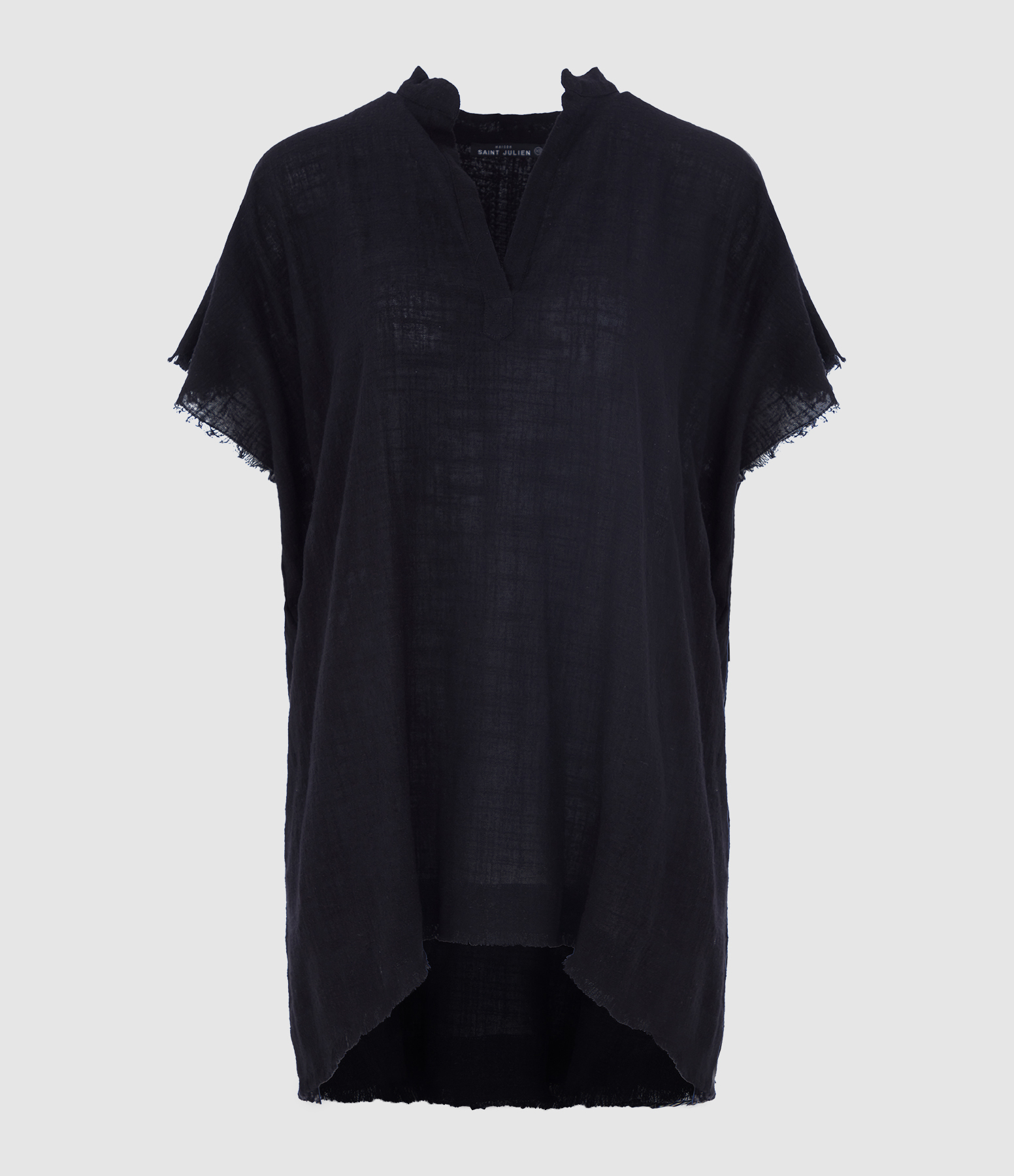 Tunique courte à manches et épaules tombantes, confectionnée en gaze de coton doux et texturé. Elle présente une encolure en V et des bords effilochés aux manches et au bas.