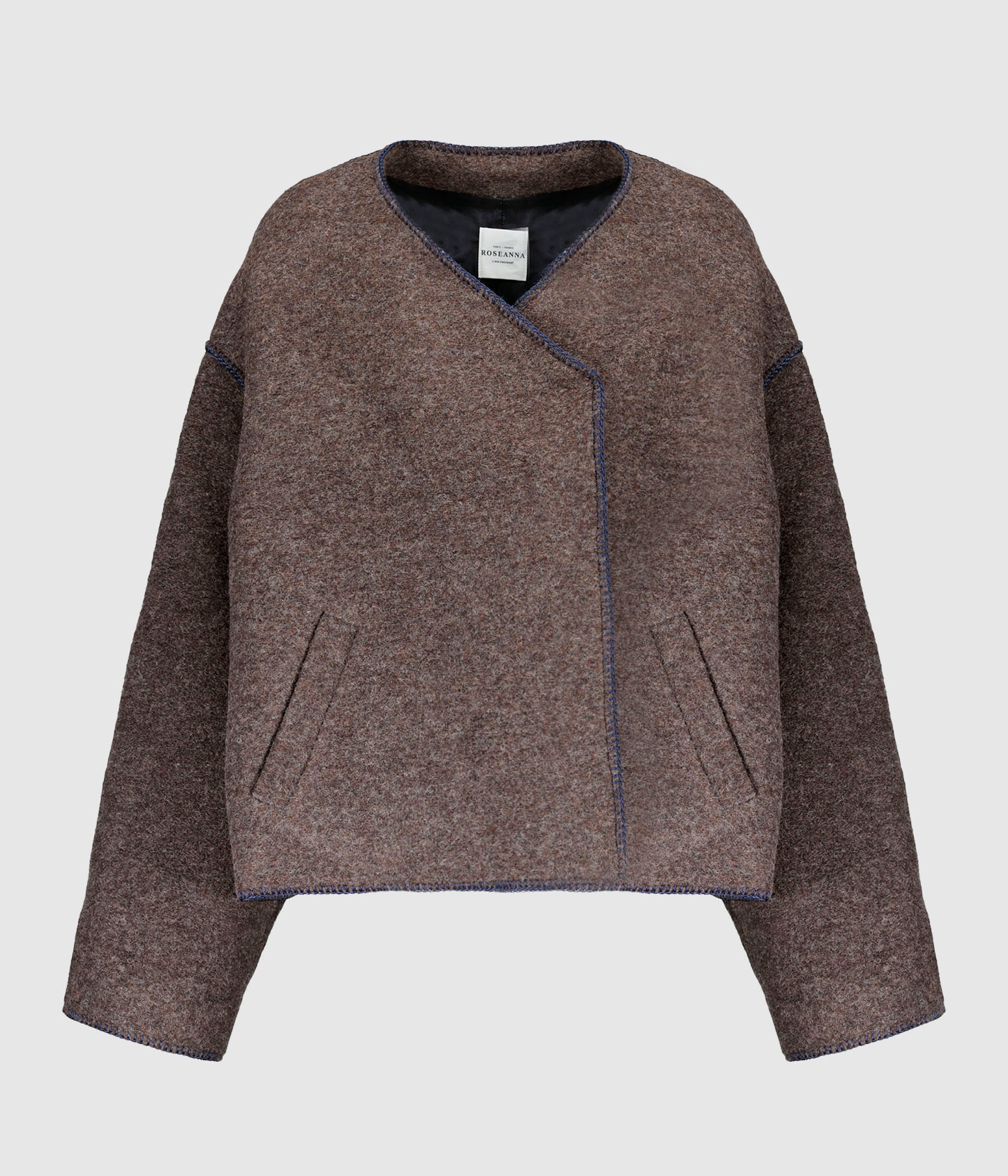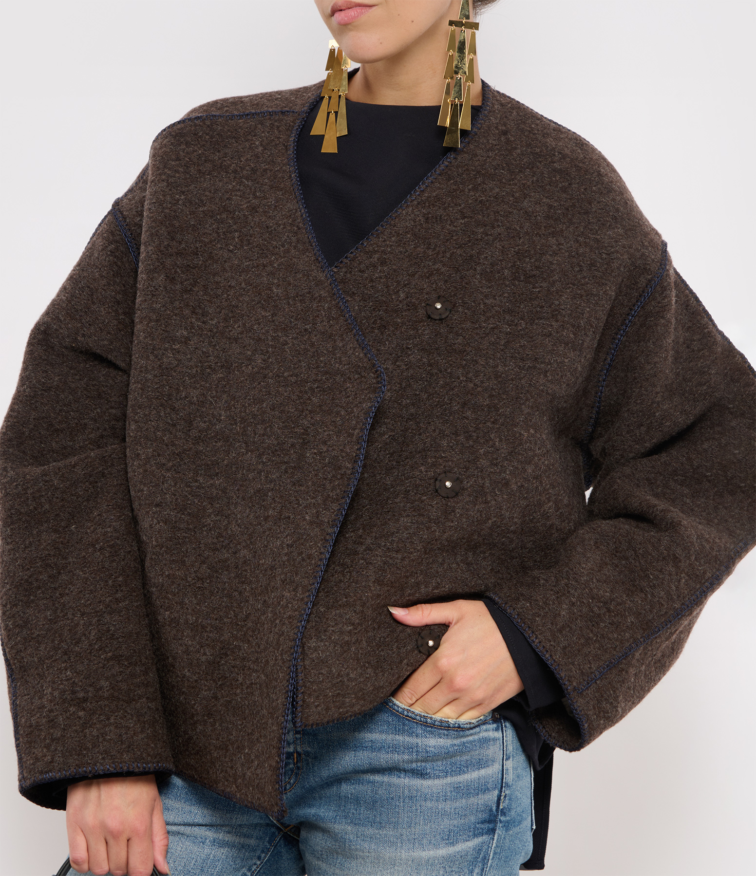 Veste en drap de laine mélangée marron et découpes graphiques. Broderie feston noire sur l’ensemble de la pièce. Manches longues. Boutonnage caché. Coupe boxy.