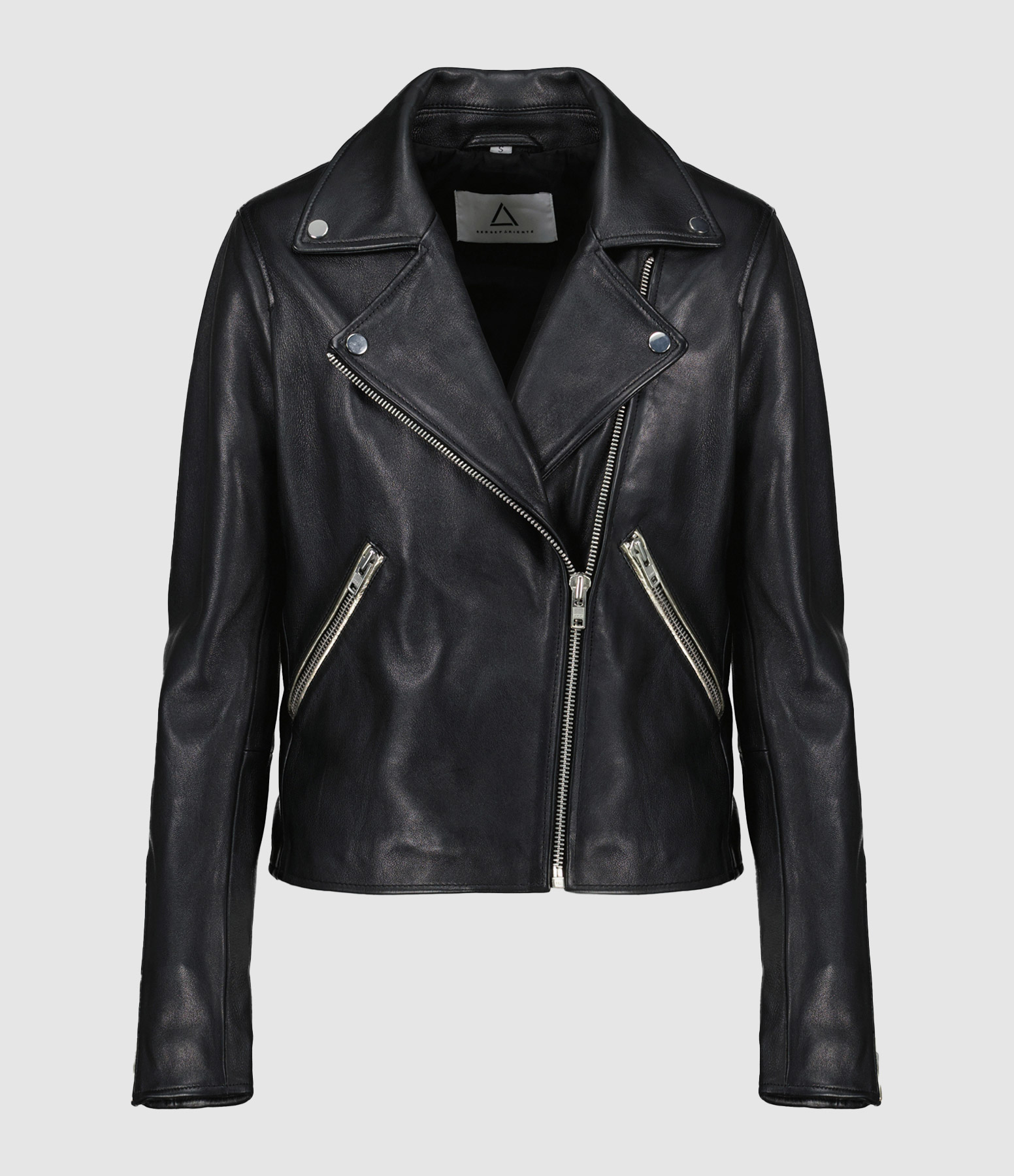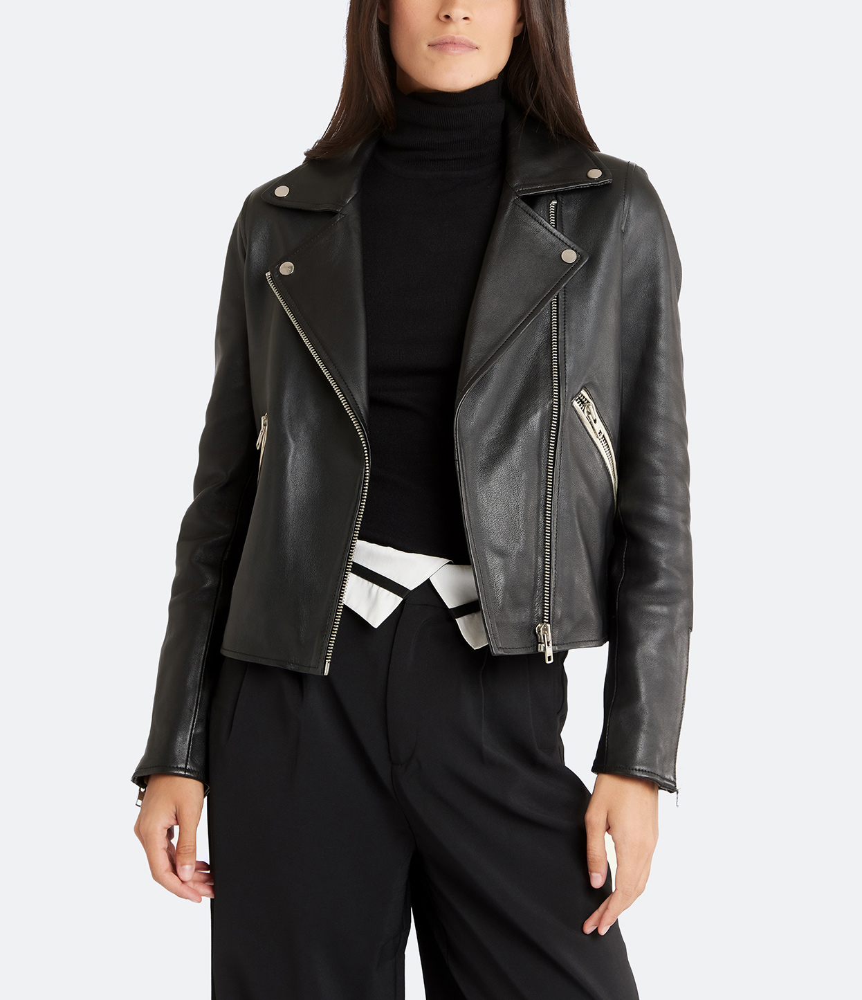 Veste perfecto en cuir noir. Fermeture zip asymétrique argenté. Pattes de serrage sur les épaules. 2 poches zippées et pressionnées sur le devant. Manches longues zippées aux poignets. Coupe droite. Base droite avec ceinture amovible.
