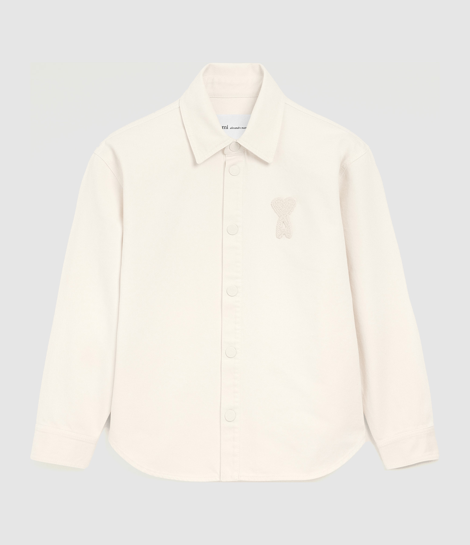Veste unisexe à coupe oversize avec col classique, fermeture devant et poignets à boutons denim de même coloris, et signe brodé sur la poitrine.