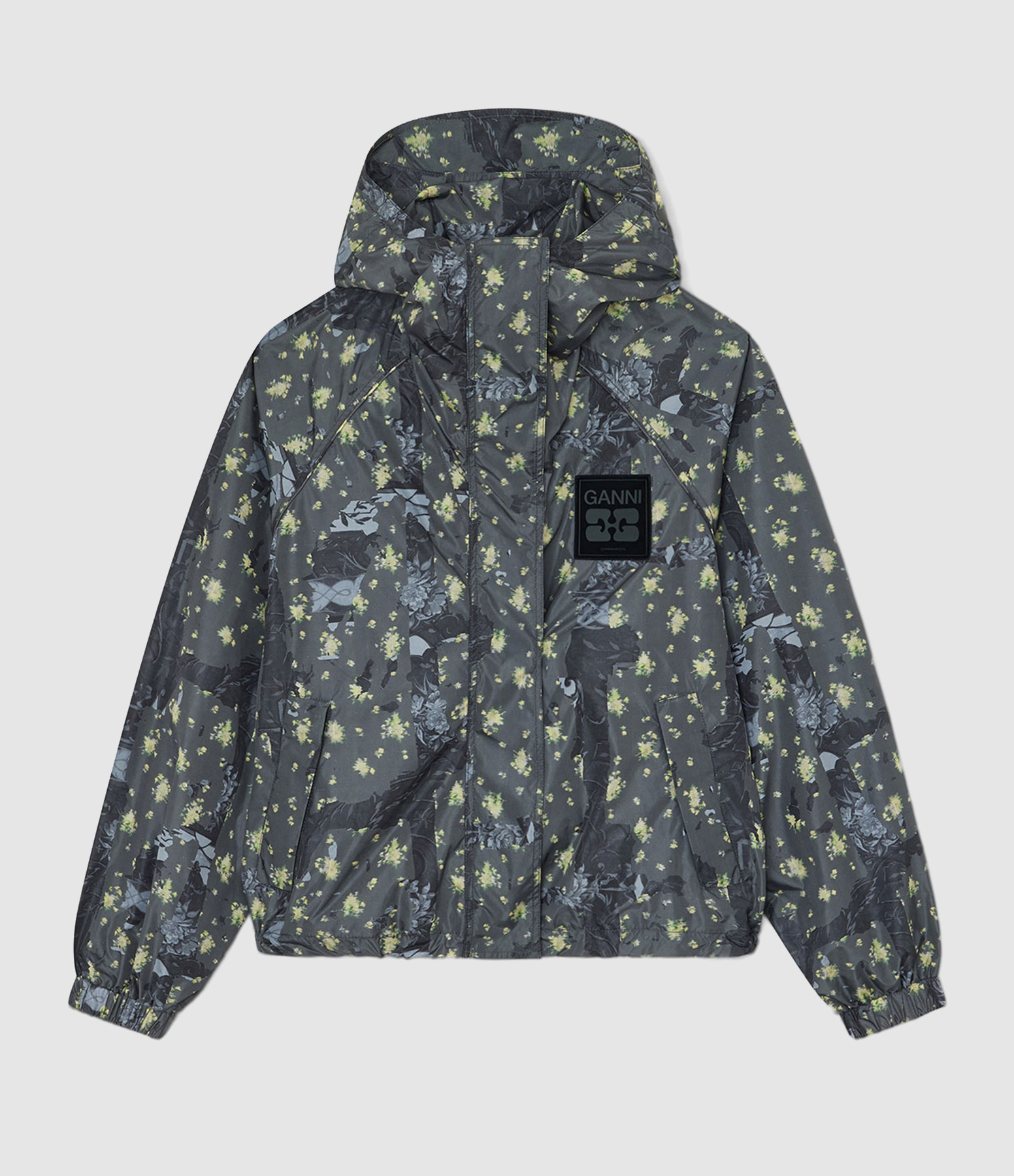 Veste avec capuche et fermeture zippée, dotée d’un ourlet à cordon. Elle présente deux poches latérales, un patch logo GANNI sur la poitrine et des motifs floraux.