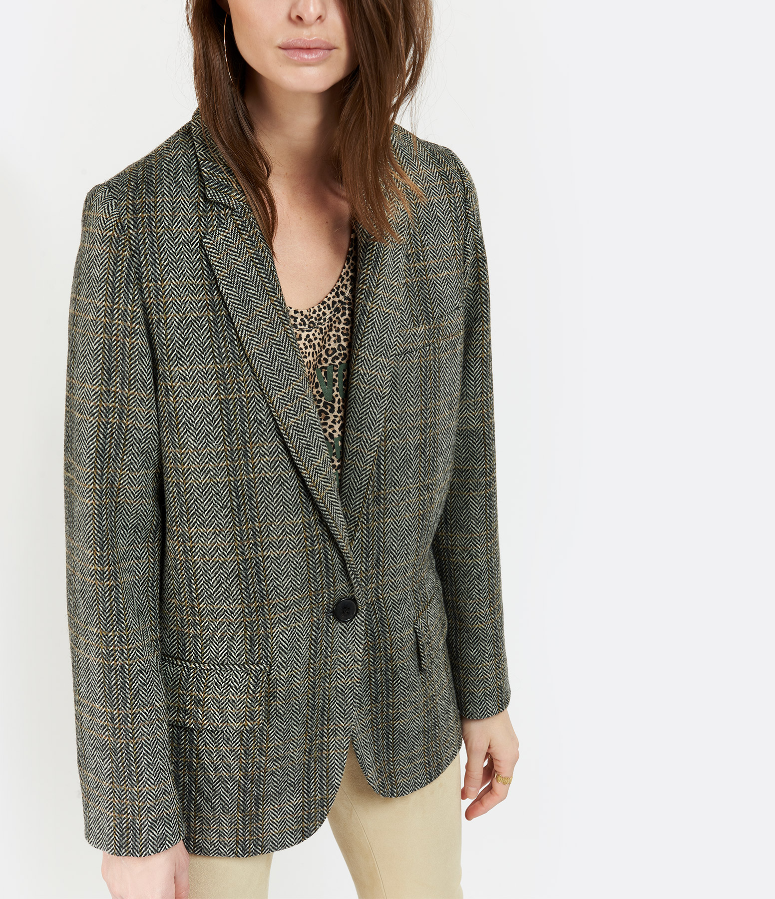 Veste blazer en laine tissée chevron. Col tailleur fermé par un bouton. Manches longues. Deux poches à rabats à l'avant et une poche poitrine. Base droite. Non doublée.