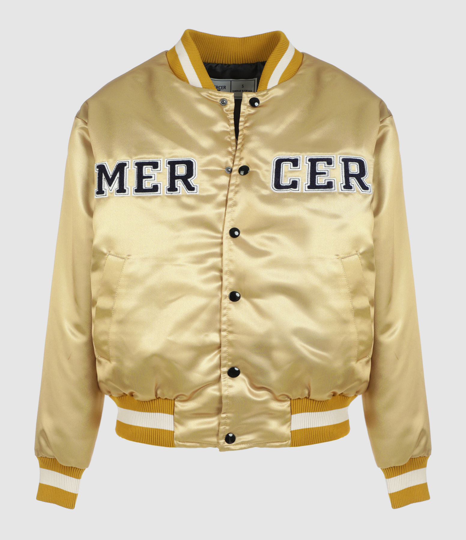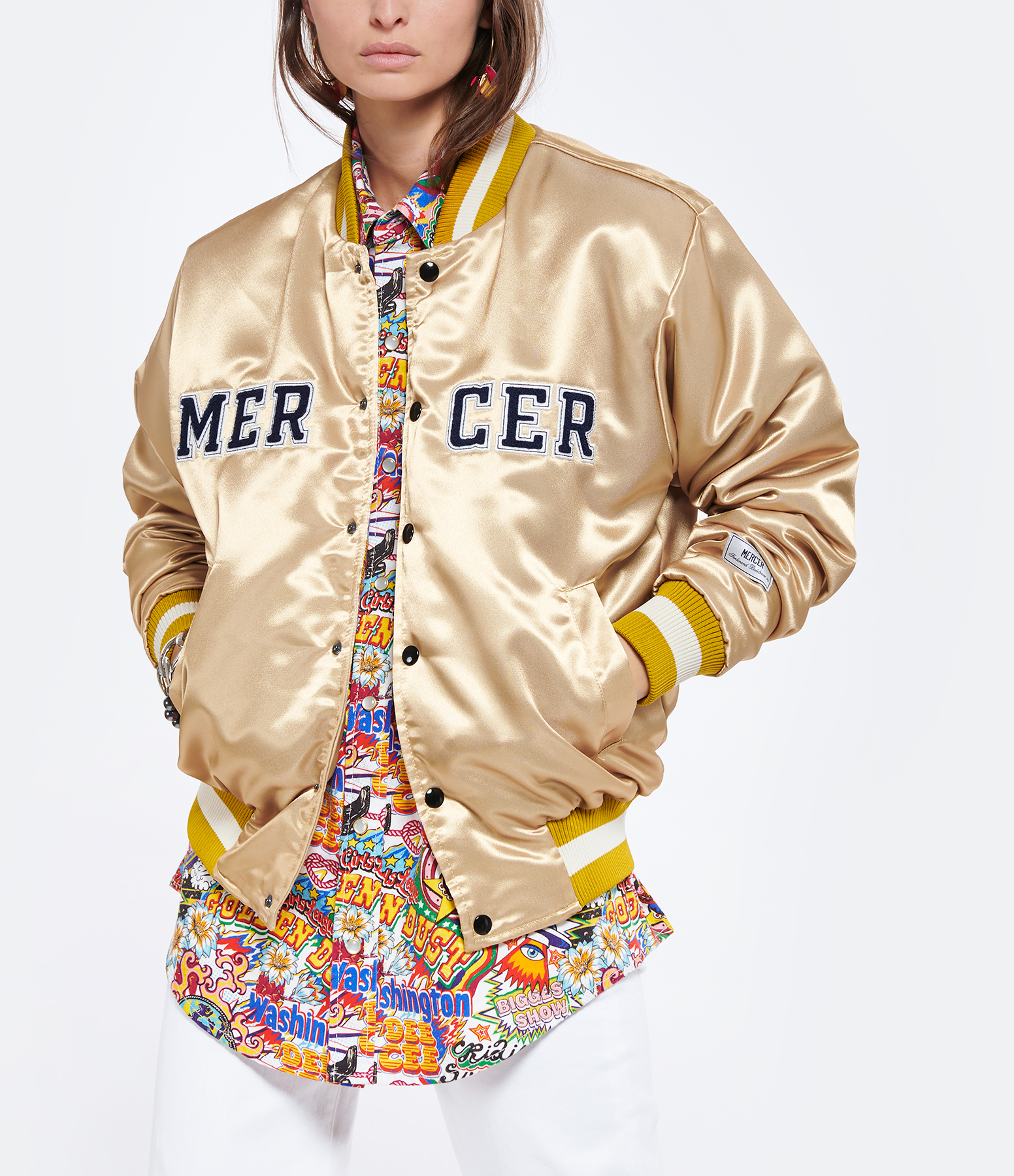 Veste bomber satinée avec écussons "MERCER" à l'avant. Fermeture à boutons pressions. Deux poches passepoilées avec bouton et poche plaquée à l'intérieur. Manches longues élastiquées aux poignets. Coupe droite. Base droite.