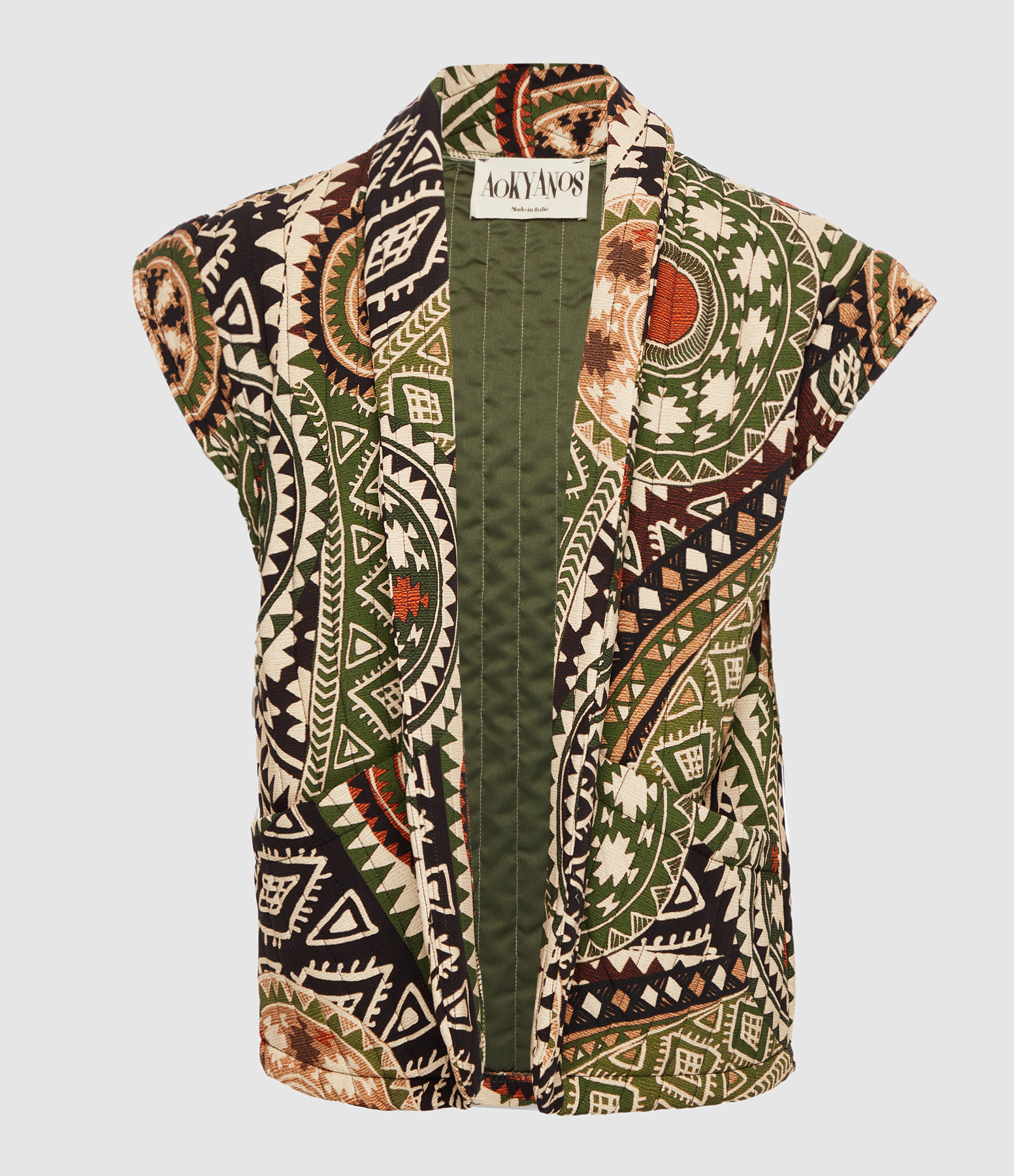 Gilet en gaze de coton à imprimé multicolore, sans manches. Poches plaquées. Col revers. Jeu de surpiqûres ton sur ton apparentes. Coupe droite.