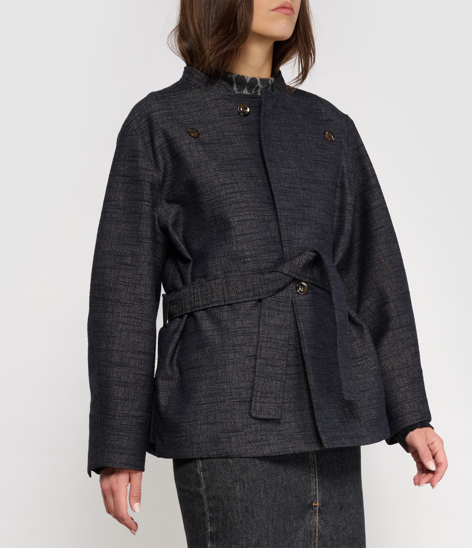 Veste en denim de coton bleu foncé chiné. Coupe large. Ceinture assortie ajustable à la taille. Manches amples arrondies. Fermeture boutonnée à l'avant. Fentes sur les côtés