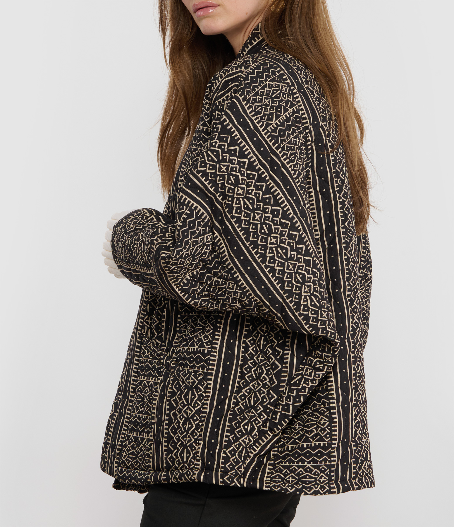 Veste coupe loose en coton noir à imprimé blanc. Surpiqures apparentes. Deux poches plaquées à l'avant.