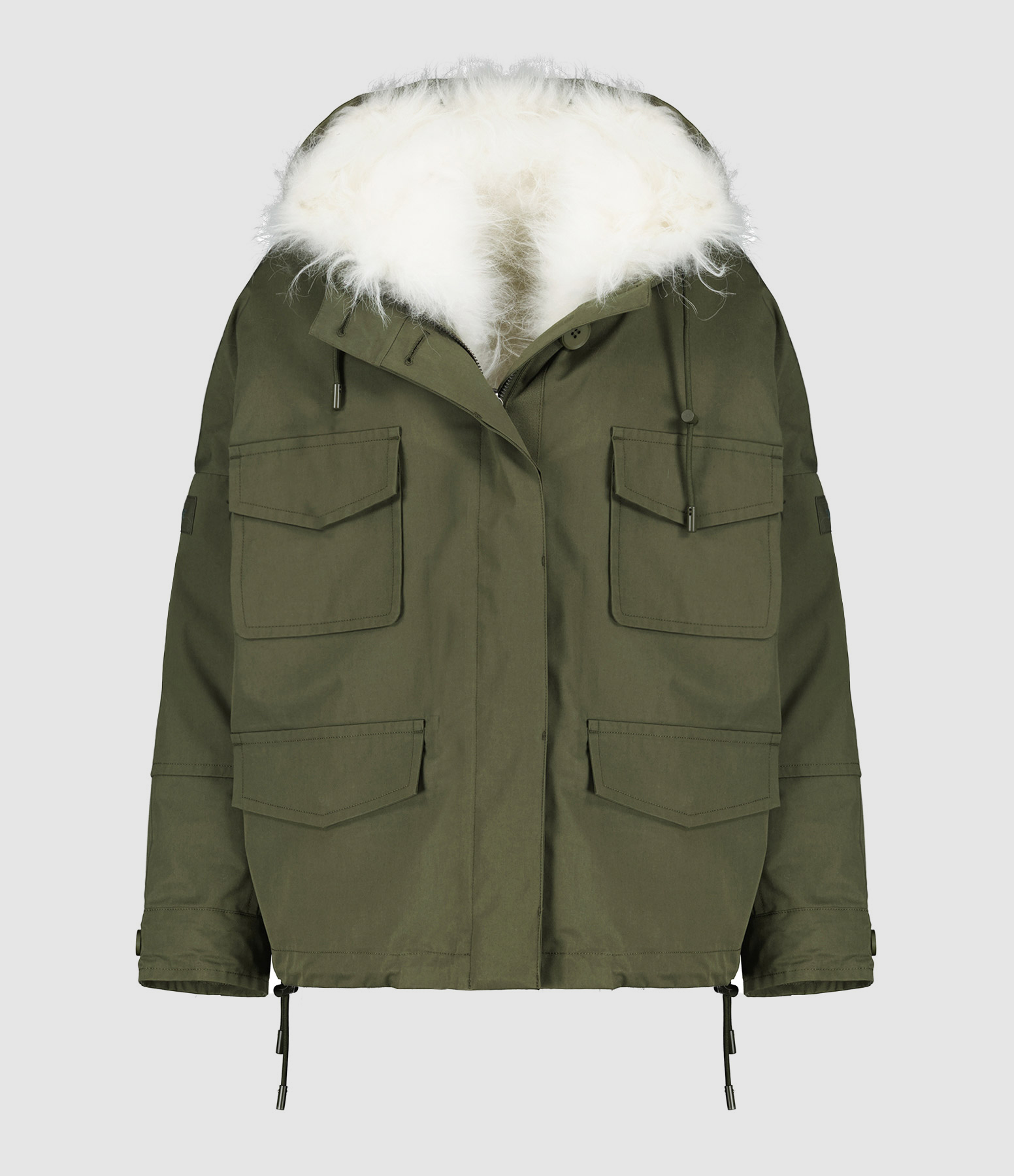 Parka courte à capuche en coton vert et fourrures. Doublure en fourrures amovible par boutons pressions. Capuche avec cordons et patte de serrage. Manches longues avec patte de serrage au poignet. Un patch avec logo cousu sur la manche gauche. Fermeture zippée et boutons sur le devant. Quatre poches pressionnées prises dans des découpes sur le devant. Deux fentes latérales pressionnées. Coupe droite. Base droite avec cordons de serrage.
