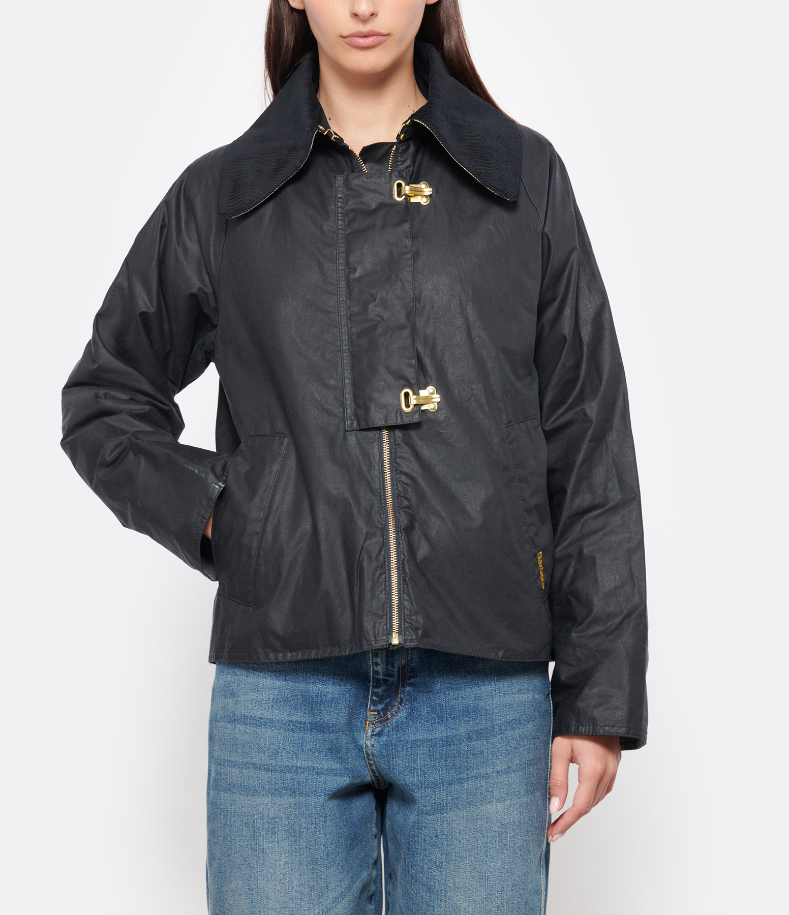 Veste en coton ciré noir. Col en velours côtelé. Fermeture à glissière avec empiècement et rivets dorés. Deux poches latérales avec logo brodé. Coupe droite. Base droite.