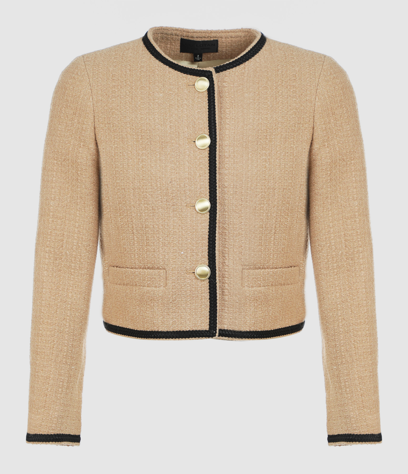 Veste courte en tweed beige. Liseré fantaisie noir. Fermeture par boutons dorés. Col arrondi. Manches longues boutonnées. Poches passepoilées. Doublée.