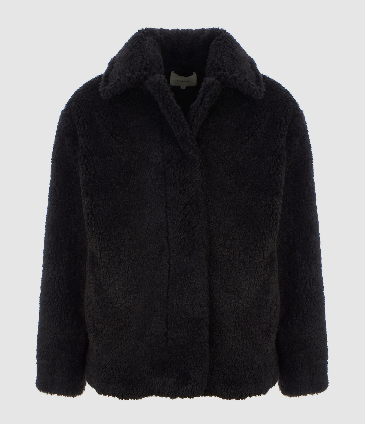 Veste en fausse fourrure noire. Col à revers. Manches longues. Deux poches fendues. Coupe droite. Base droite. Doublée.