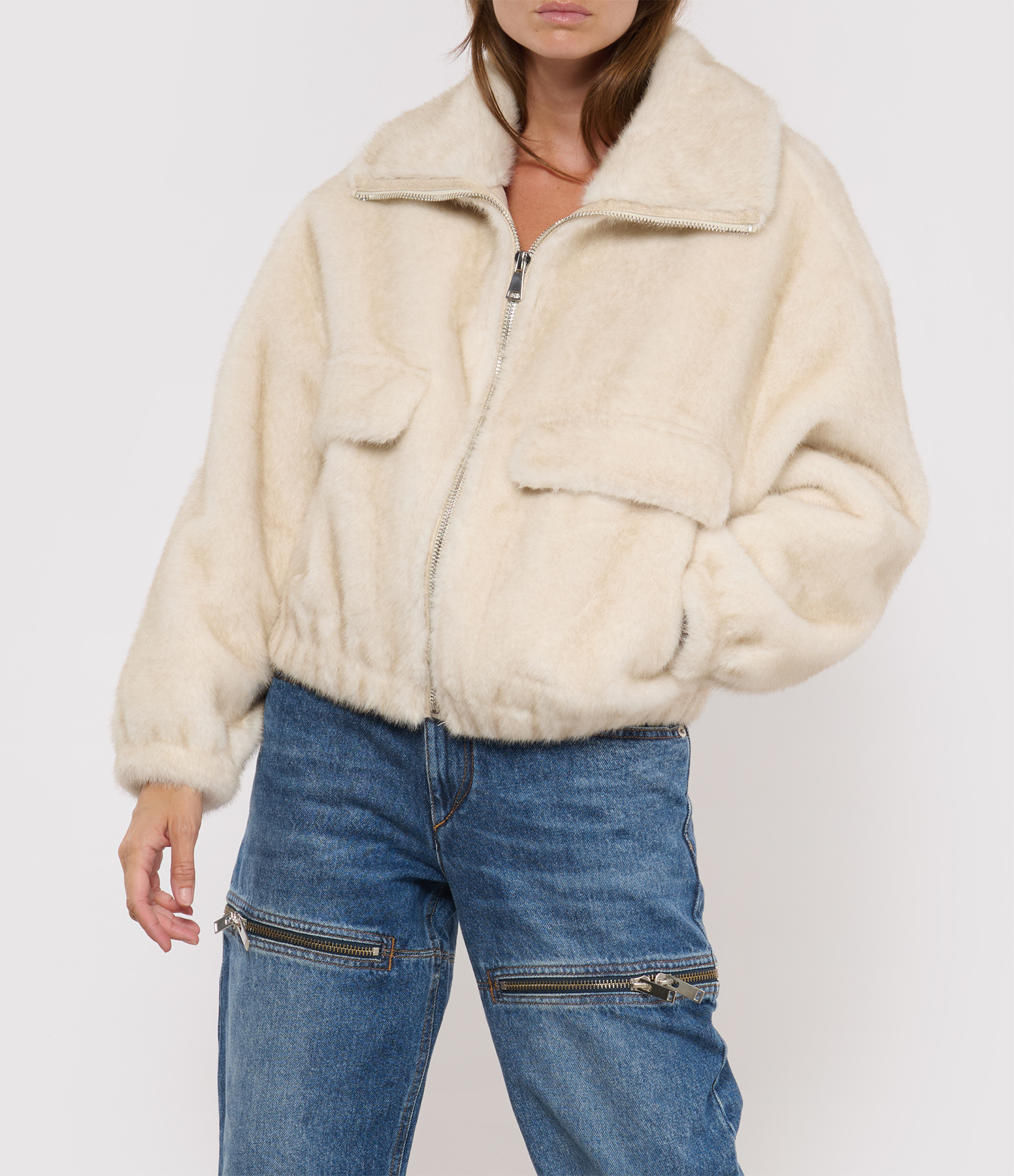 Blouson "aviateur" en fausse fourrure écrue. Manches longues larges. Coupe oversize. Fermeture à zip et deux poches à rabat sur l'avant.
