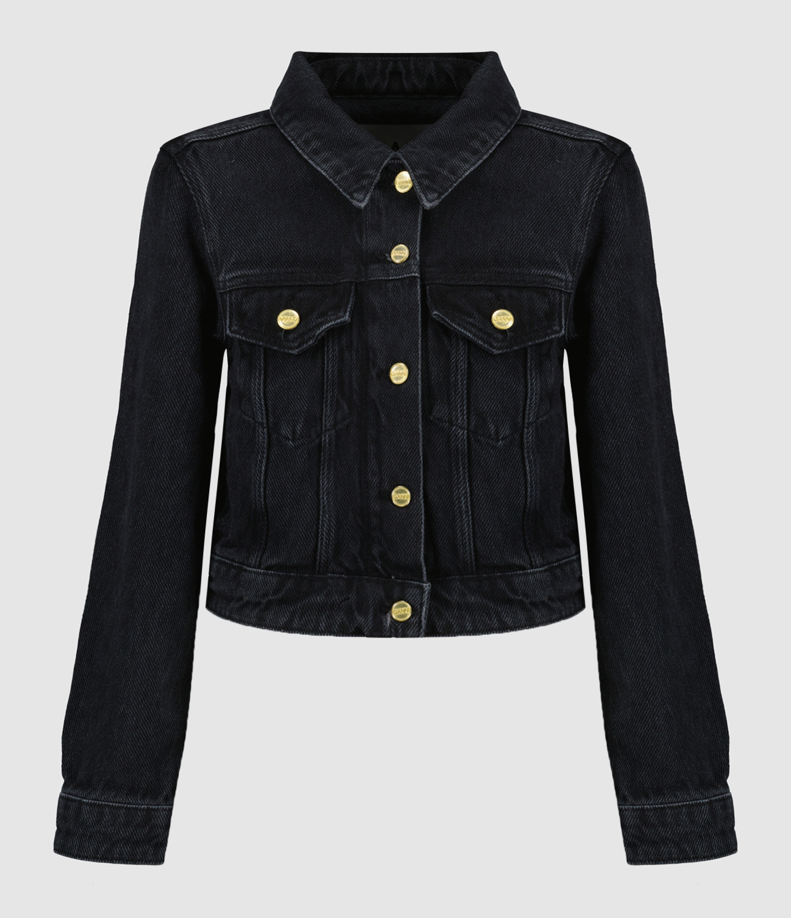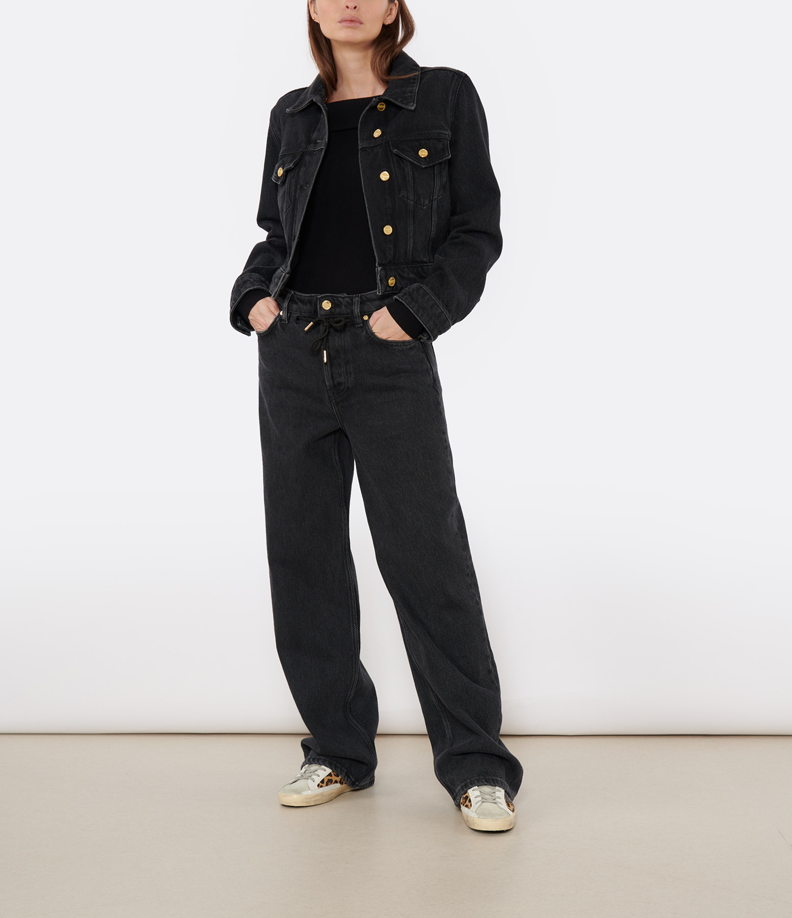 Veste courte en denim de coton côtelé noir. Col chemise. Fermeture par boutons sur le devant. Deux poches plaquées à rabats sur la poitrine. Boutons dorés gravés Ganni. Manches longues. Coupe droite. Base droite avec pattes de serrage dans le dos.