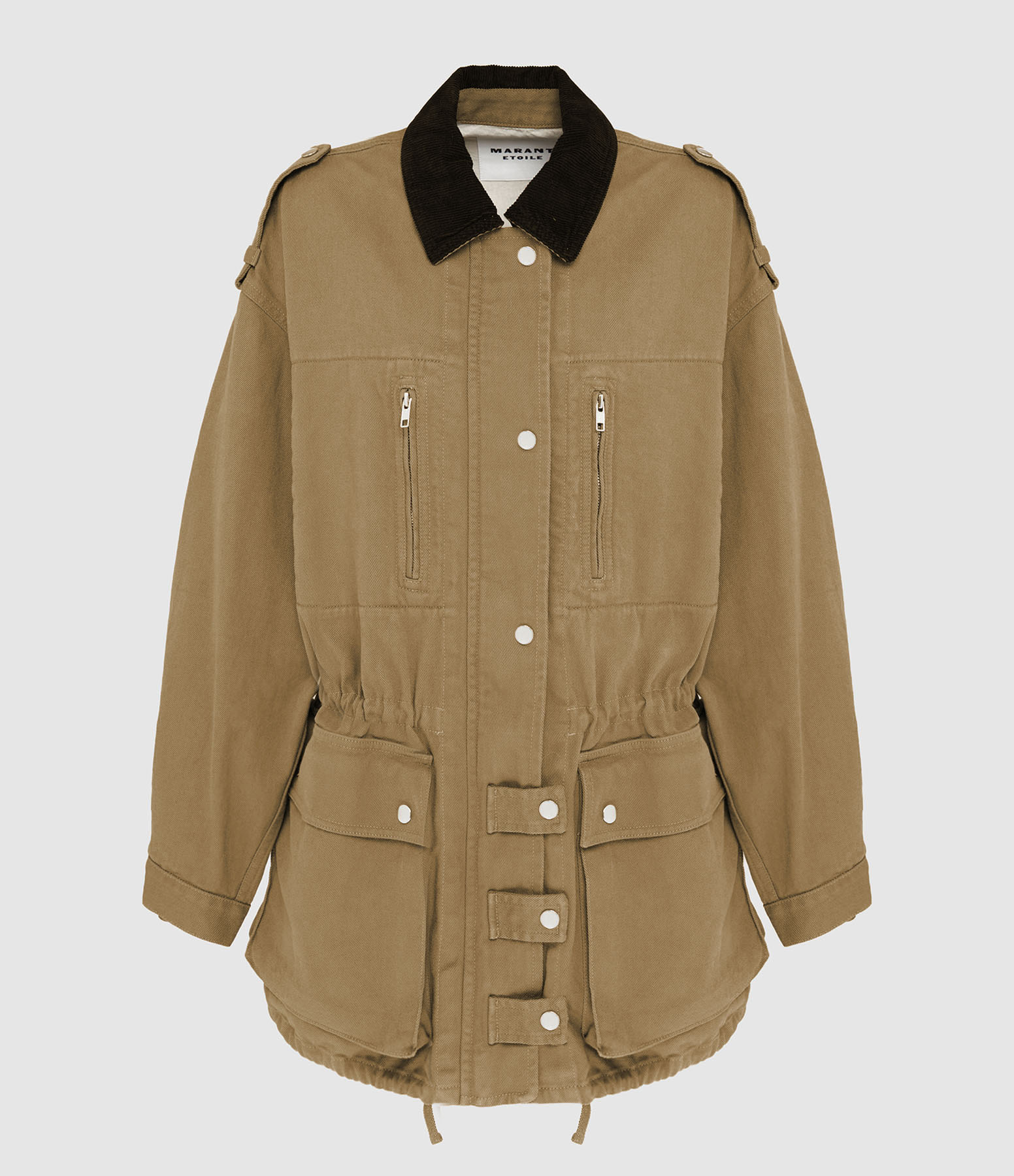 Veste en denim côtelé kaki. Col chemise contrastant noir en velours côtelé. Manches longues à poignets pressionnés et à pattes d'épaules. Fermeture à boutons pression et zip. Ceinture réglable par lacets. Quatre poches à l'avant. Surpiqures ton sur ton.