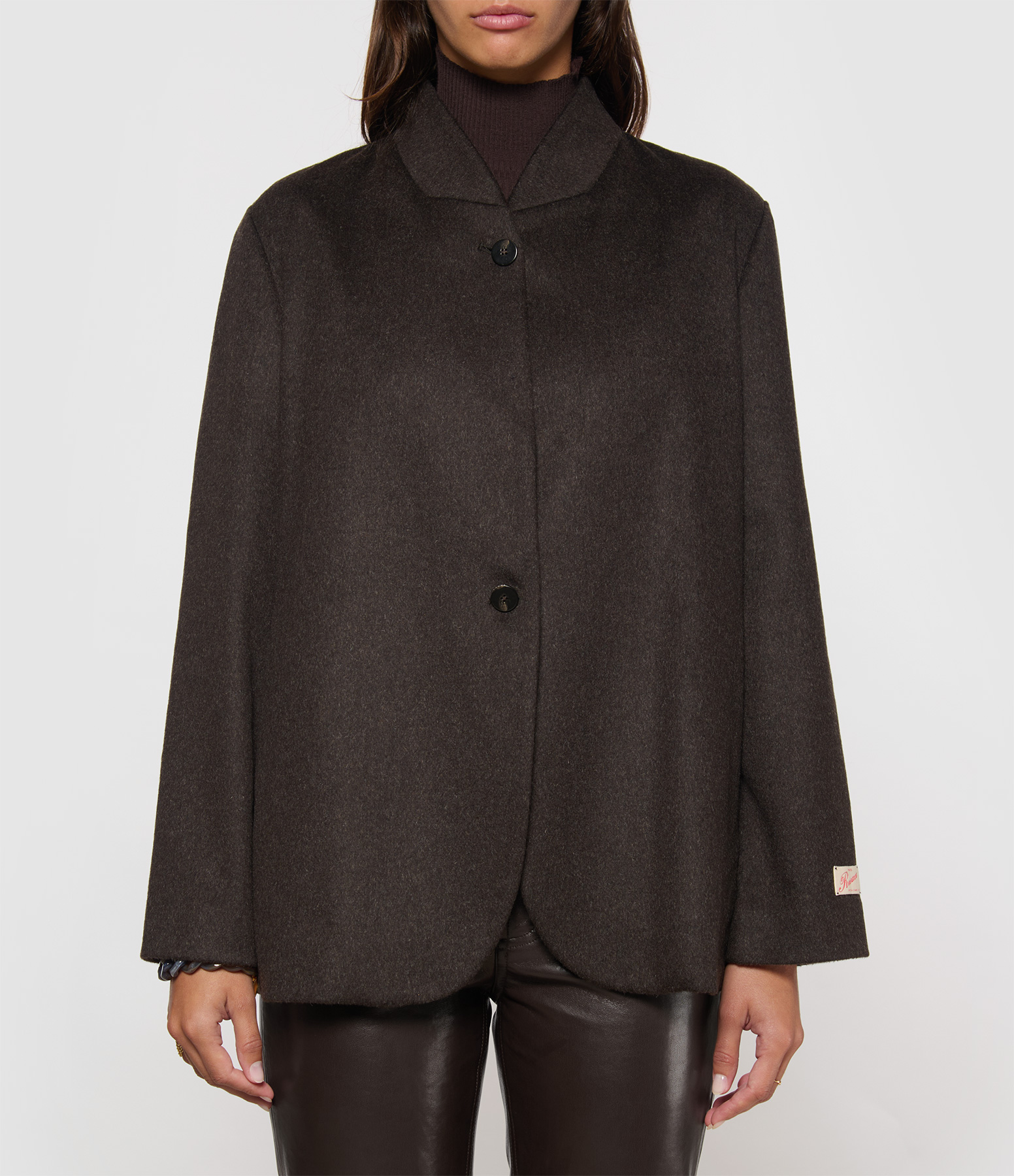 Veste droite marron col châle en matière effet peau de pêche. Boutonnage classique à deux boutons. Deux poches latérales.