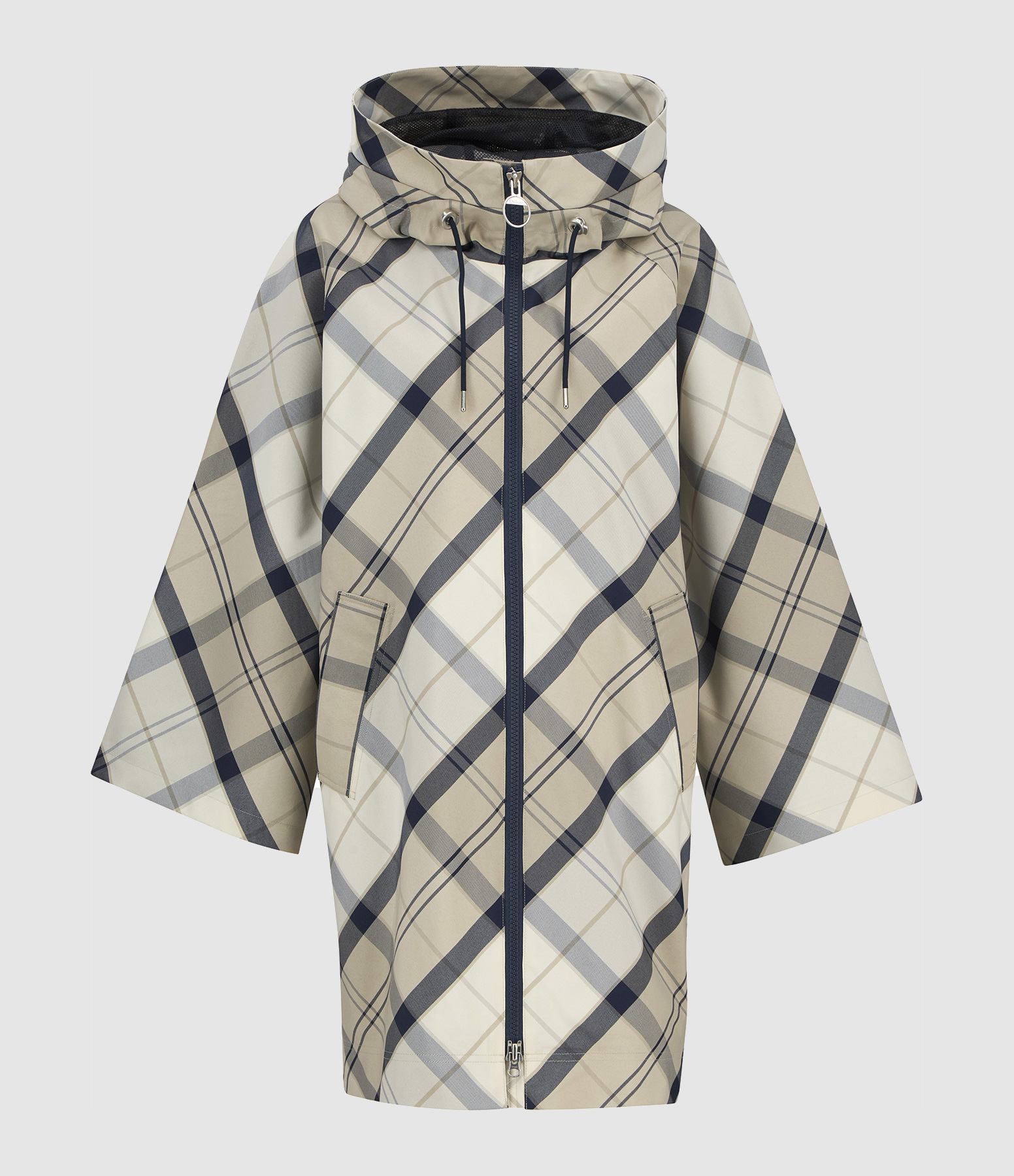 Veste à col montant et coupe ample, manches longues, avec fermeture zippée, poches sur les côtés et imprimé à carreaux.