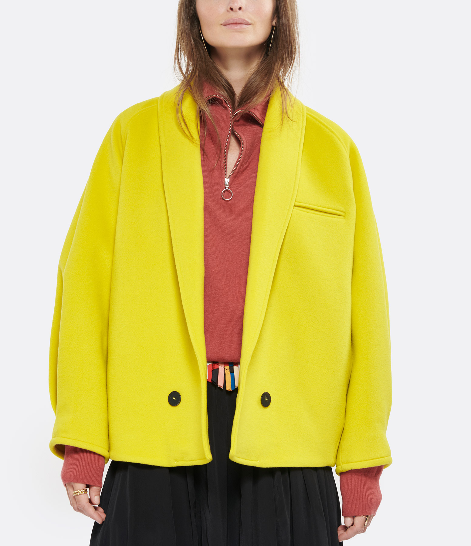 Veste courte en laine jaune. Col châle. Manches longues et amples avec un pli sur le devant. Une fausse poche passepoilée poitrine sur le devant. Deux poches italiennes sur le devant. Fermeture boutonnée croisée sur le devant avec double boutonnage. Boutons noirs. Couture milieu dos. Coupe droite large. Base droite. Doublée.