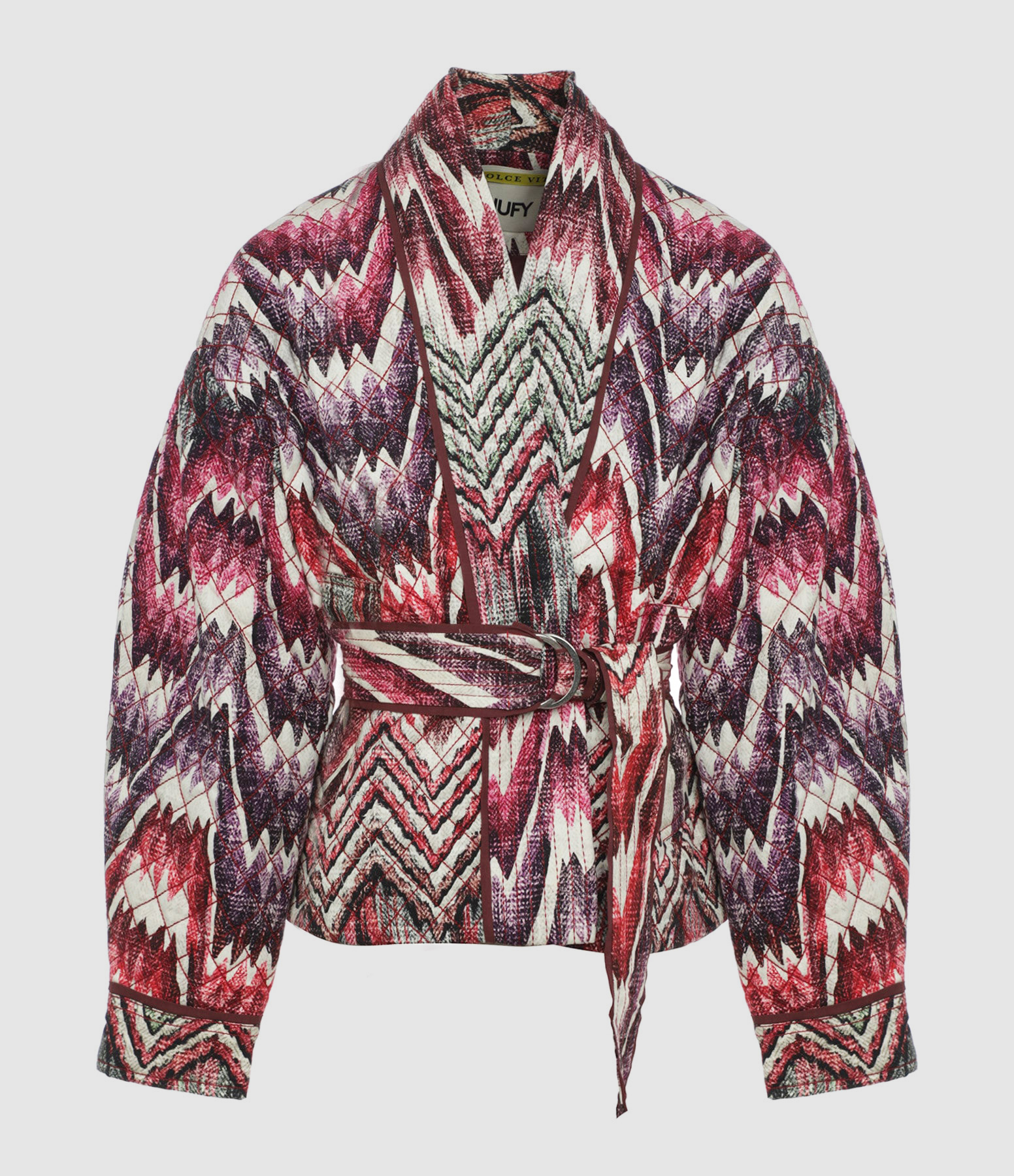 Conseil stylistique : Au carrefour de plusieurs influences, cette veste vous fera voyager. On l'apprécie pour sa coupe kimono, ses manches bouffantes et son motif incomparable.