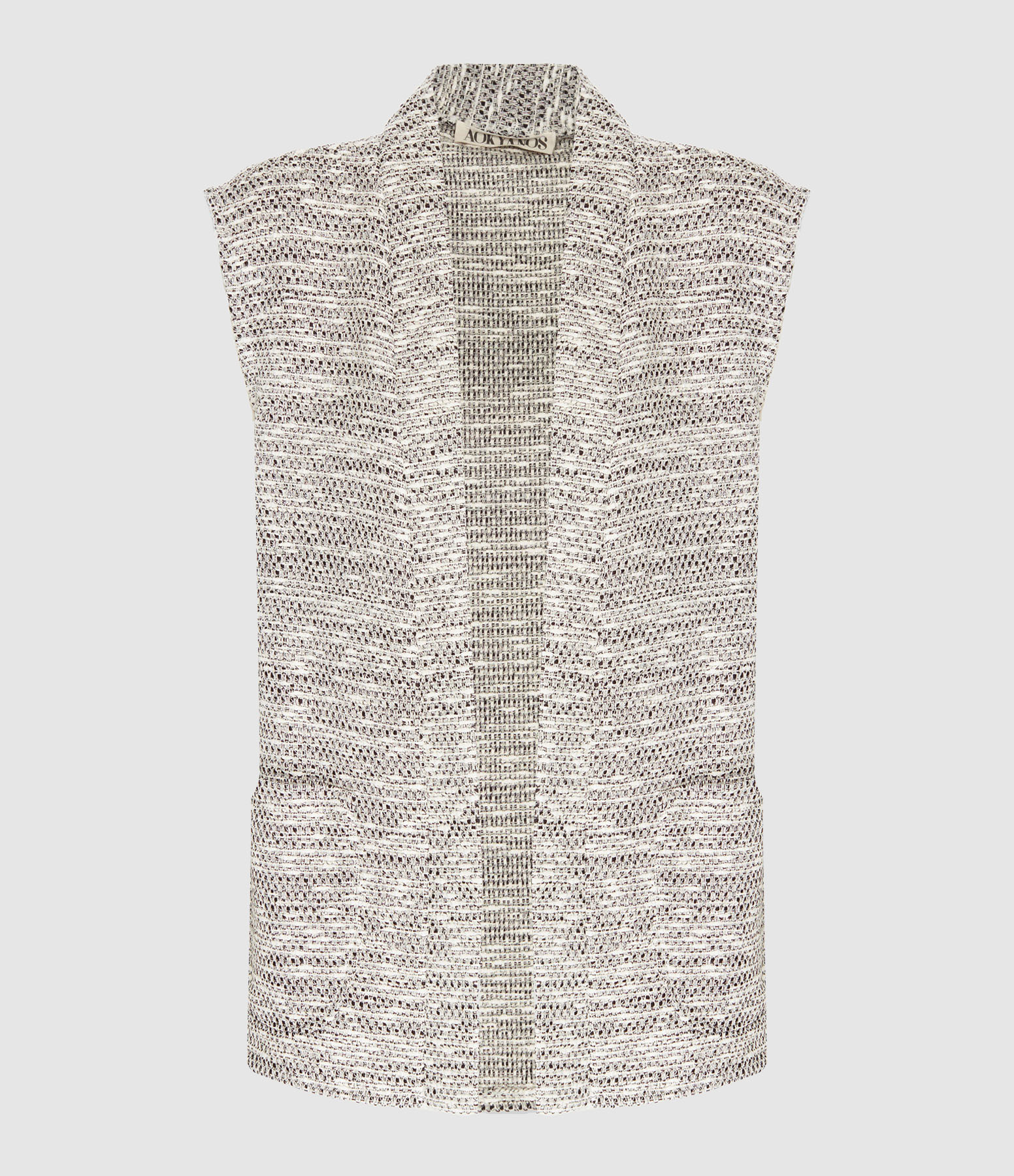 Gilet sans manches en coton noir et blanc. Col rond. Coupe droite. Base droite.