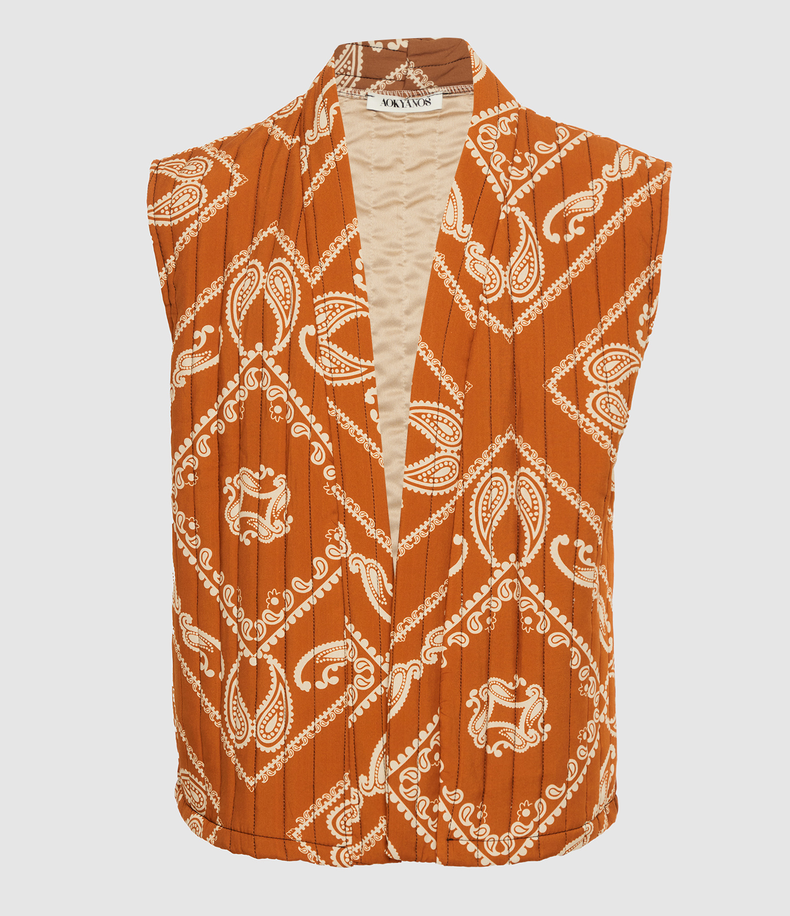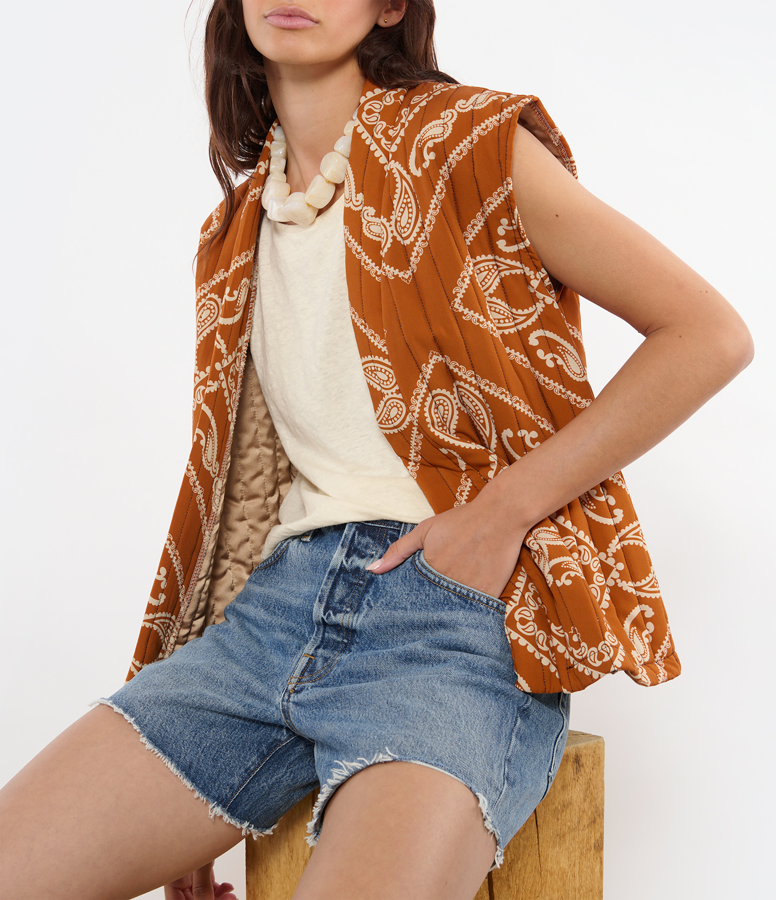 Veste sans manches orange à imprimé bandana beige. Surpiqûres noires apparentes. Poches italiennes. Coupe droite. Doublée.