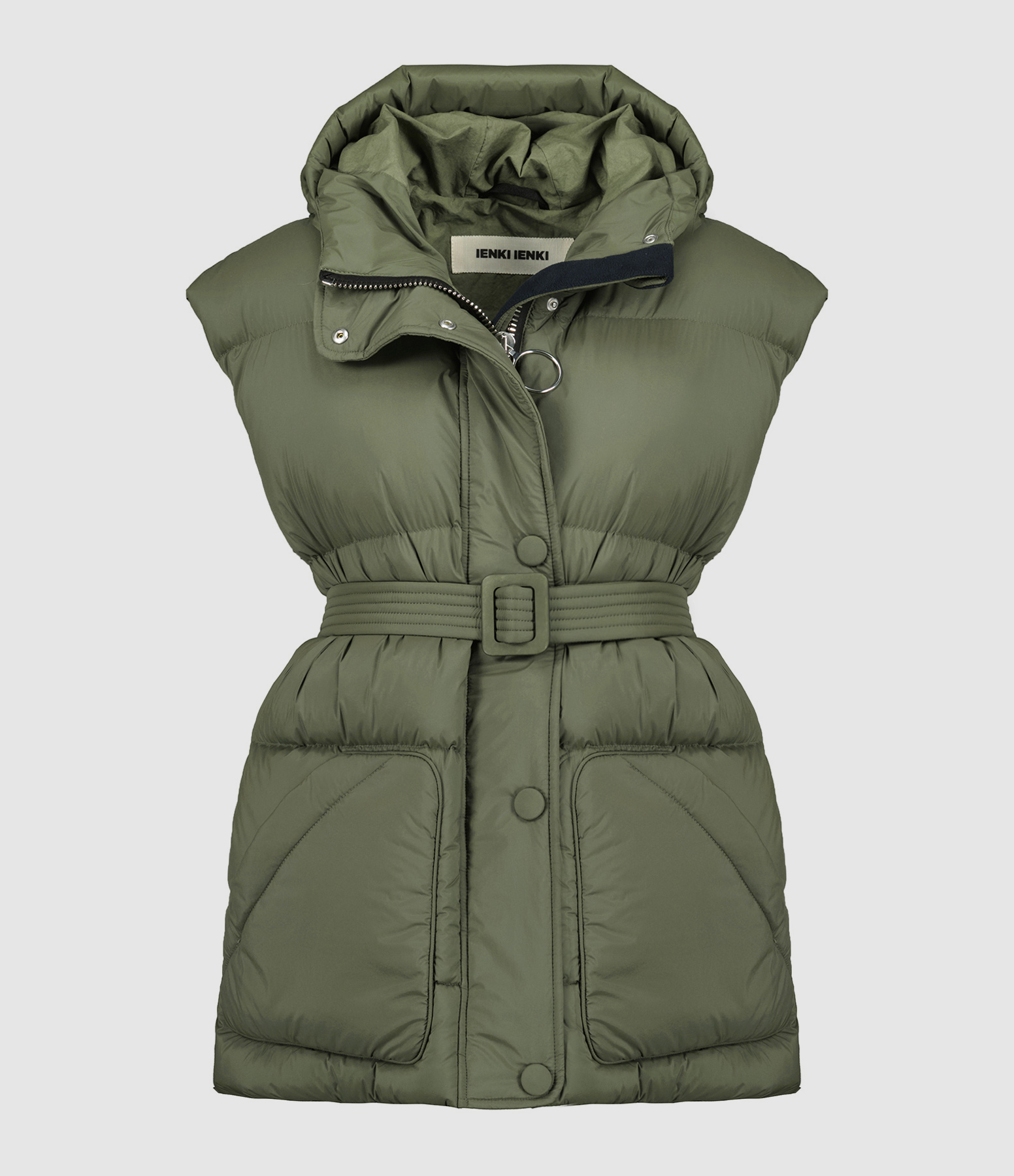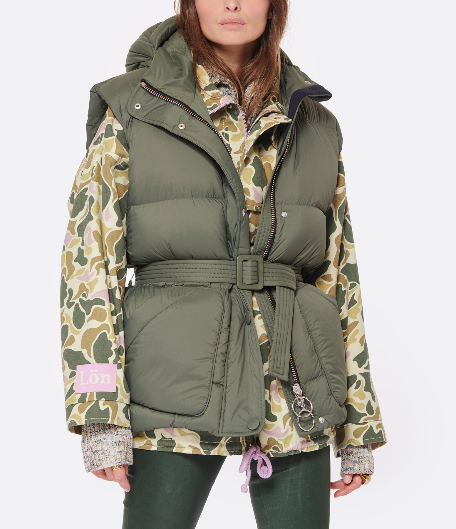 Veste sans manches matelassée kaki. Col à capuche. Fermeture zippée avec deux curseurs et pressionnée sur le devant. Ceinture à boucle carrée. Passants pour ceinture. Deux poches plaquées sur le devant. Deux poches plaquées intérieures. Coupe droite. Base droite.