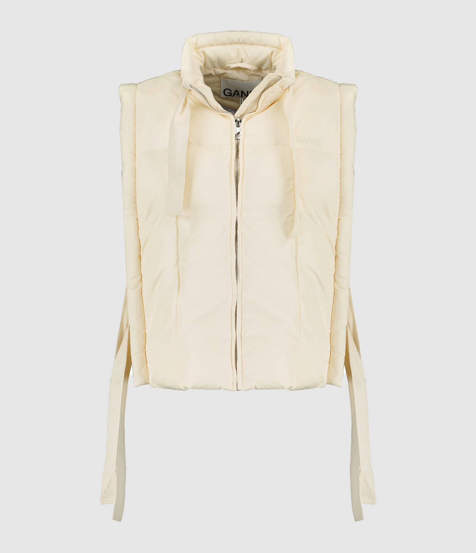 Veste matelassée écrue ornée du logo brodé ton sur ton sur le devant. Col montant avec liens de serrage. Sans manches. Emmanchures avec liens de serrage. Fermeture zippée sur le devant. Deux poches prises dans les coutures latérales sur le devant. Coupe oversize. Base droite. Doublée.