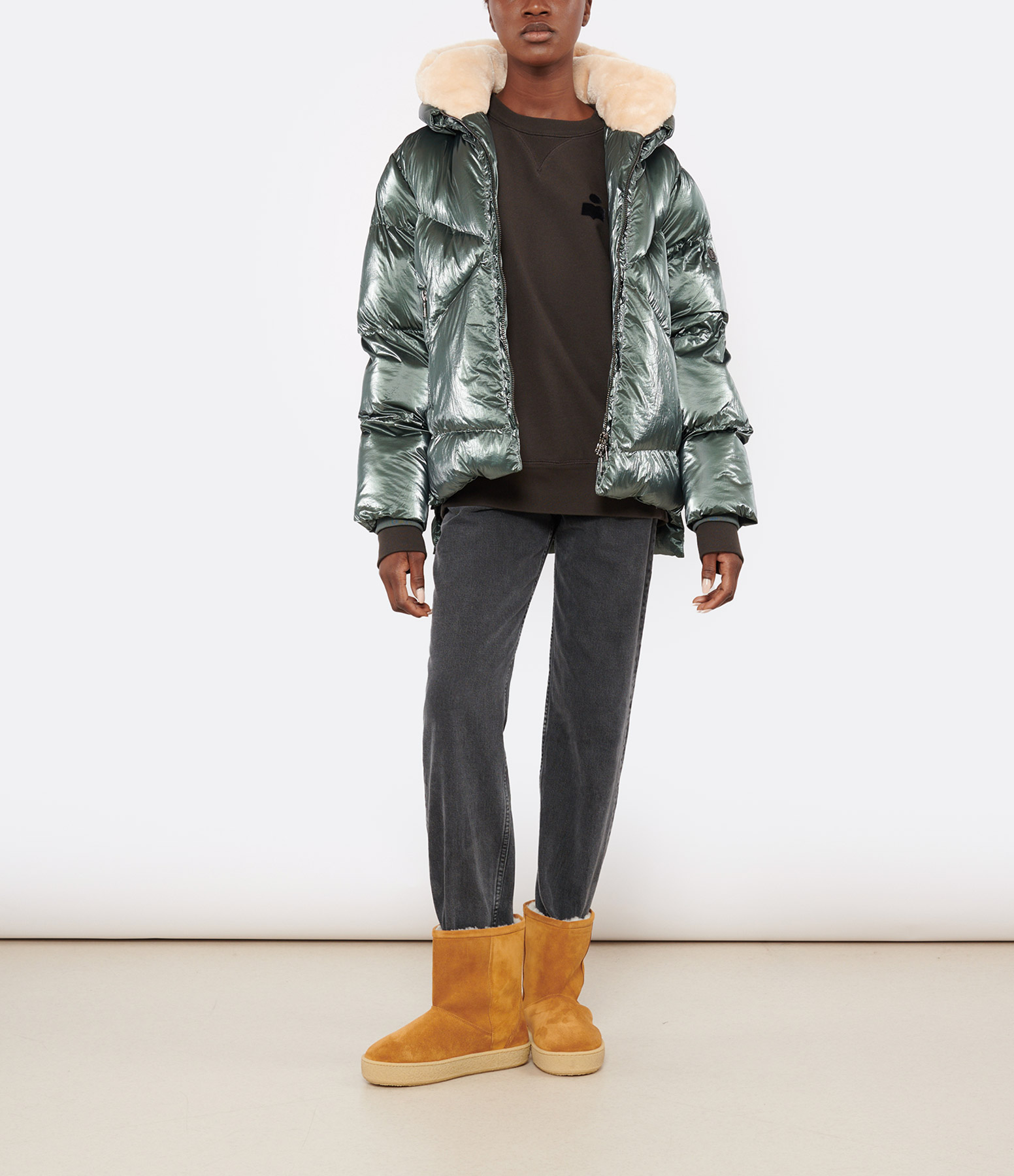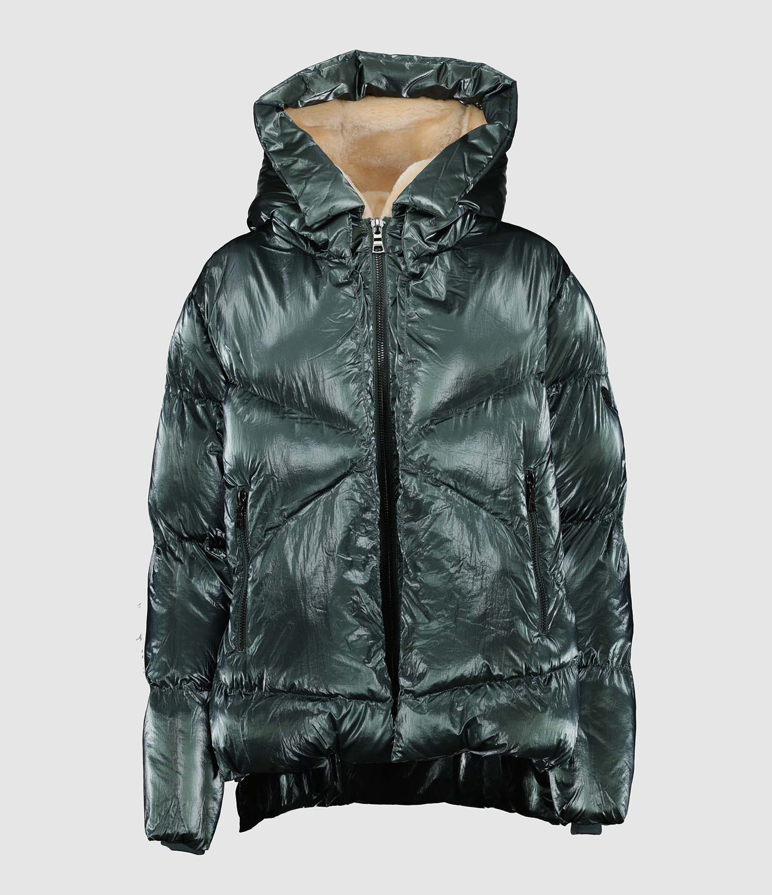 Veste doudoune matelassée en tissu technique vert métallisé. Col montant à capuche à rabat pressionné doublée en polaire beige. Manches longues avec poignets en coton molletonné côtelé. Détail logo métallique sur la manche gauche. Fermeture zippée avec double zip et pressionnée sur le devant. Deux poches zippées sur le devant. Une poche zippée intérieure. Fermetures zippées latérales pour plus d'aisance. Logo gravée sur les curseurs des zips. Coupe droite. Base droite. Doublée.