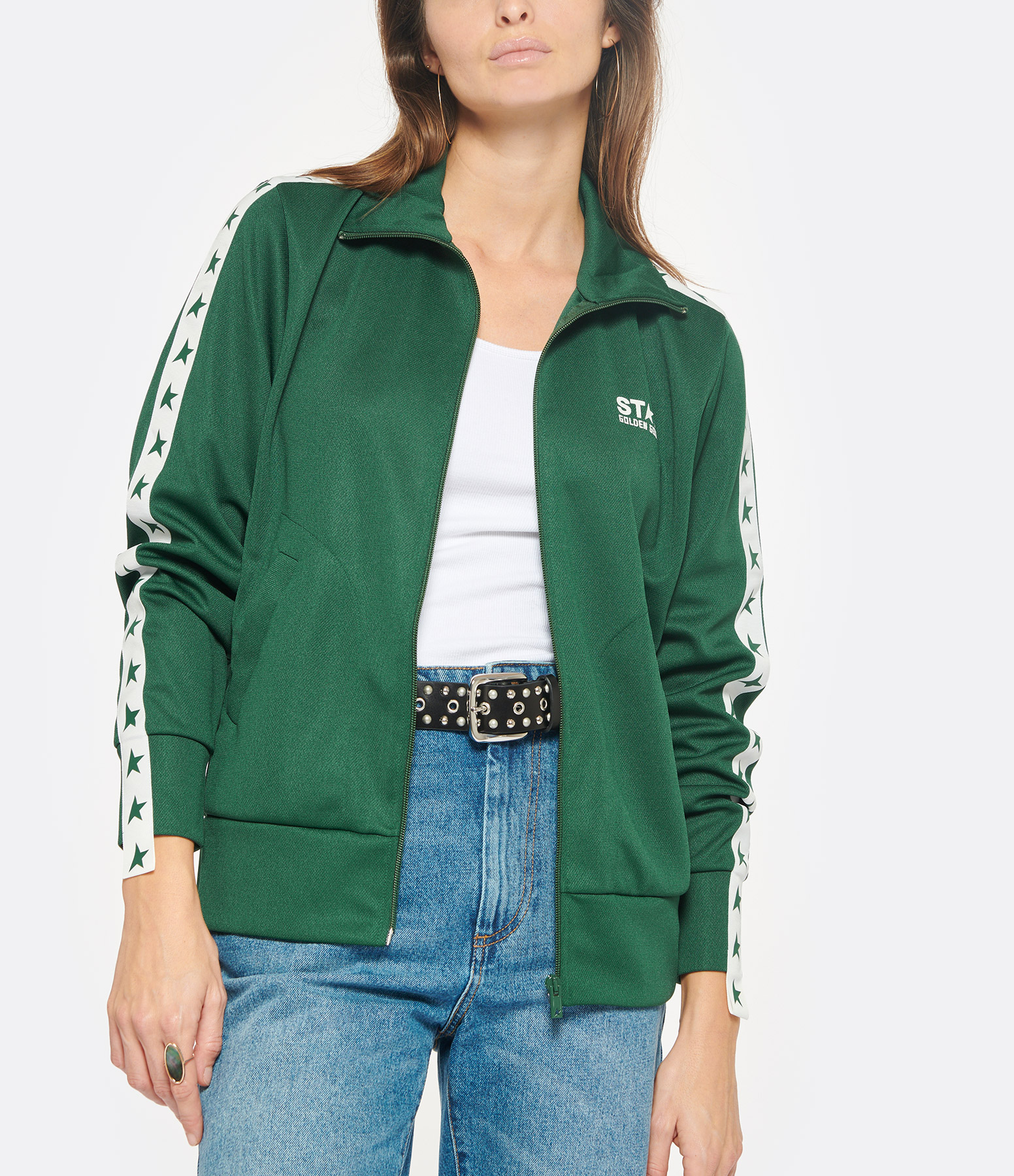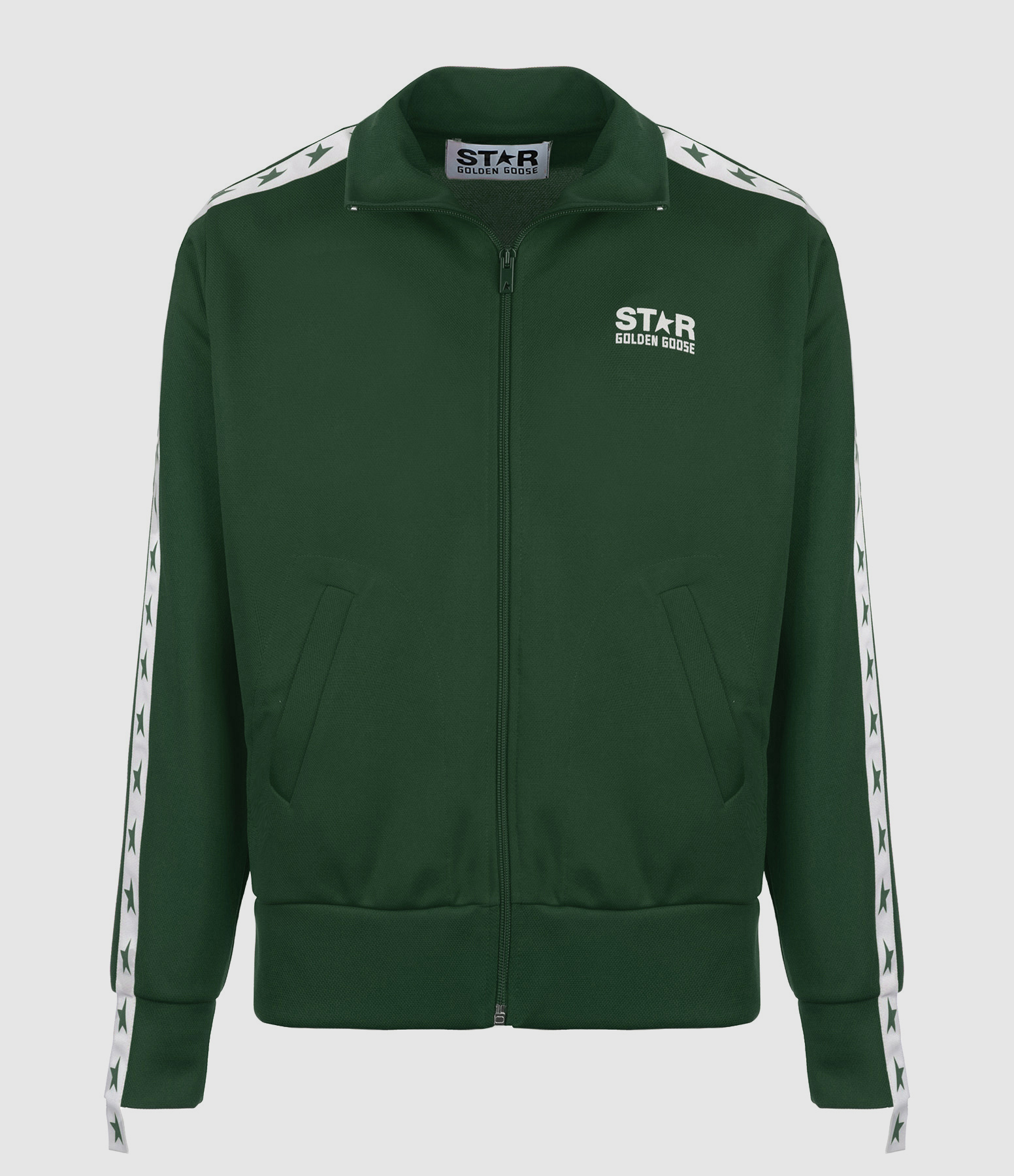 Veste sportwear vert foncé. Bandes noires avec étoiles blanches sur les manches. Inscription poitrine "STAR GOLDEN GOOSE". Bords côtés aux poignets. Deux poches à l'avant. Fermeture par zip. Base droite et élastiquée.