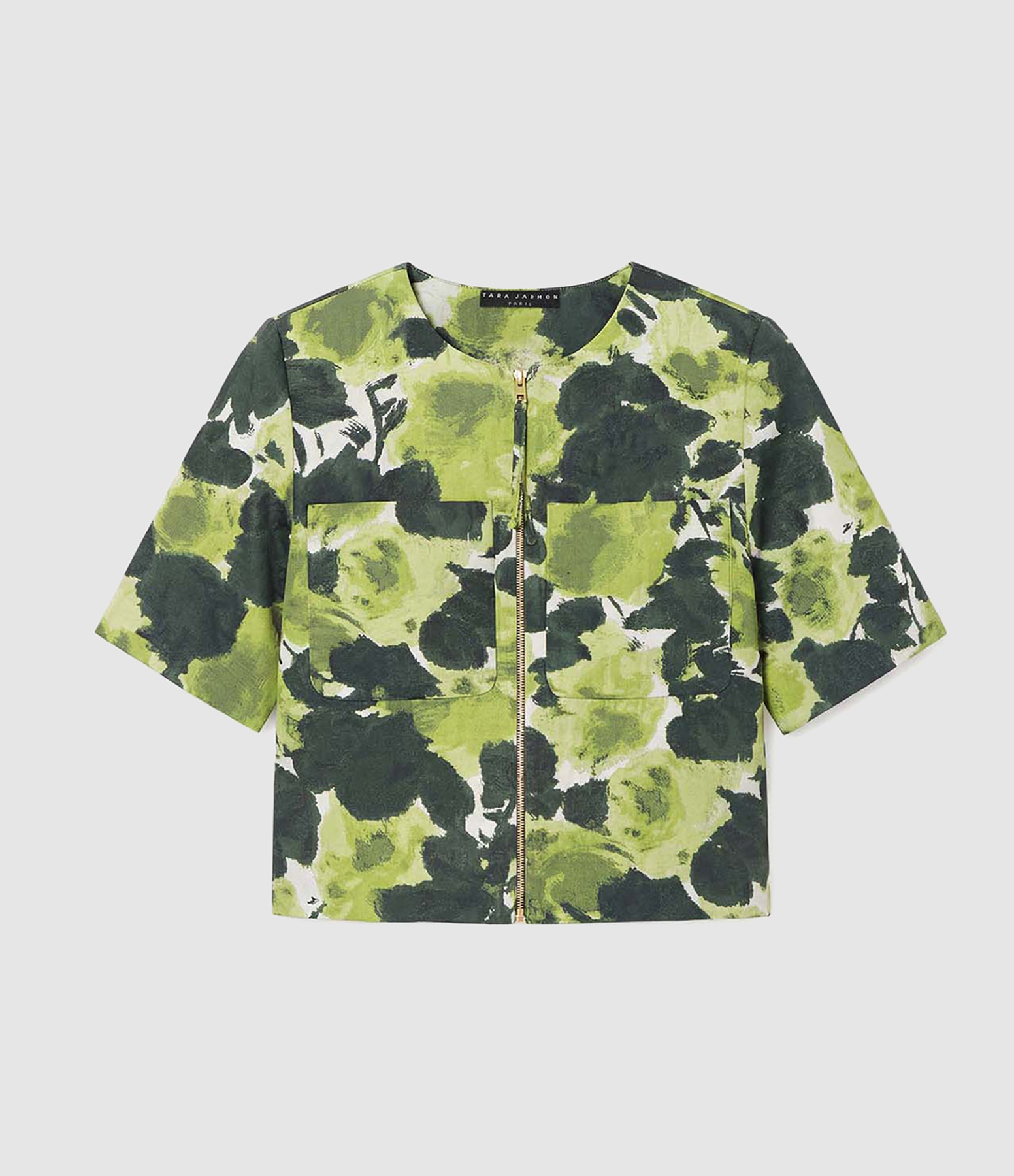 Veste courte possède des manches courtes à épaulettes et un col rond. Elle se ferme au devant par un zip doré et possède des poches plaquées à la poitrines. Elle est entièrement recouverte de motif fleurs vertes en jacquard.