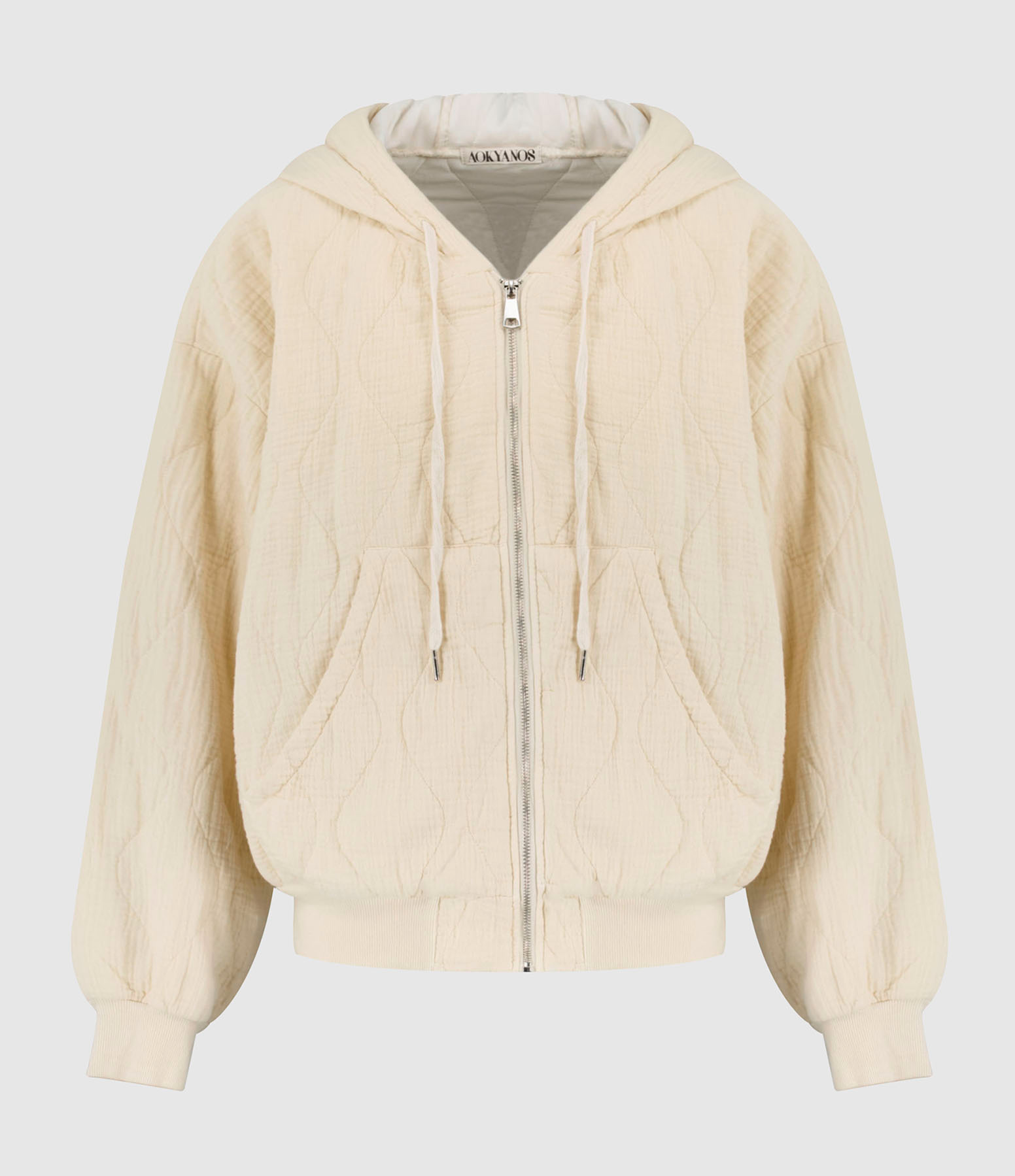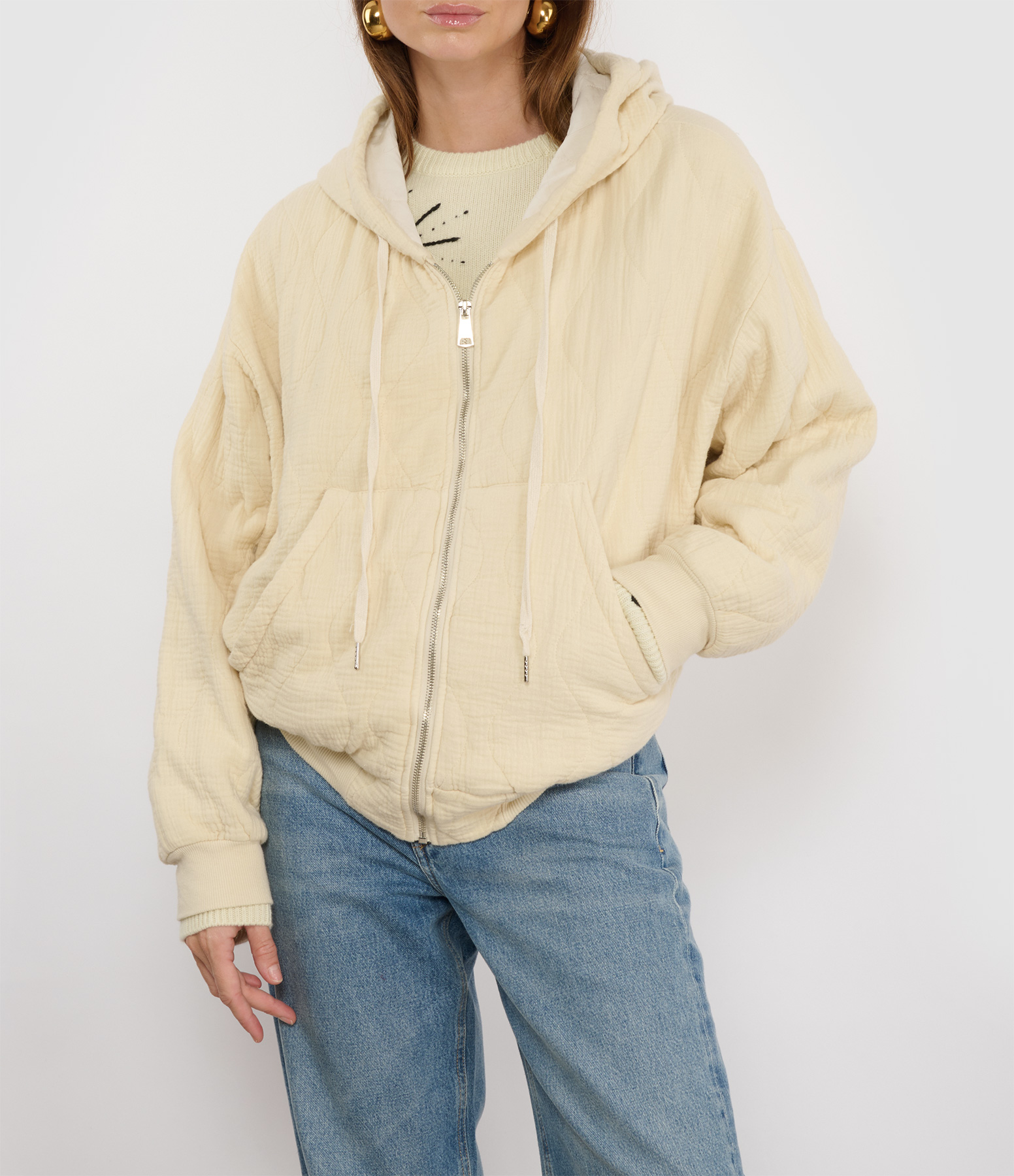 Veste d'inspiration hoodie en coton à surpiqures ton sur ton apparentes. Manches longues. Coupe droite. Capuche à cordon de serrage. Poches latérales plaquées. Base élastiquée.