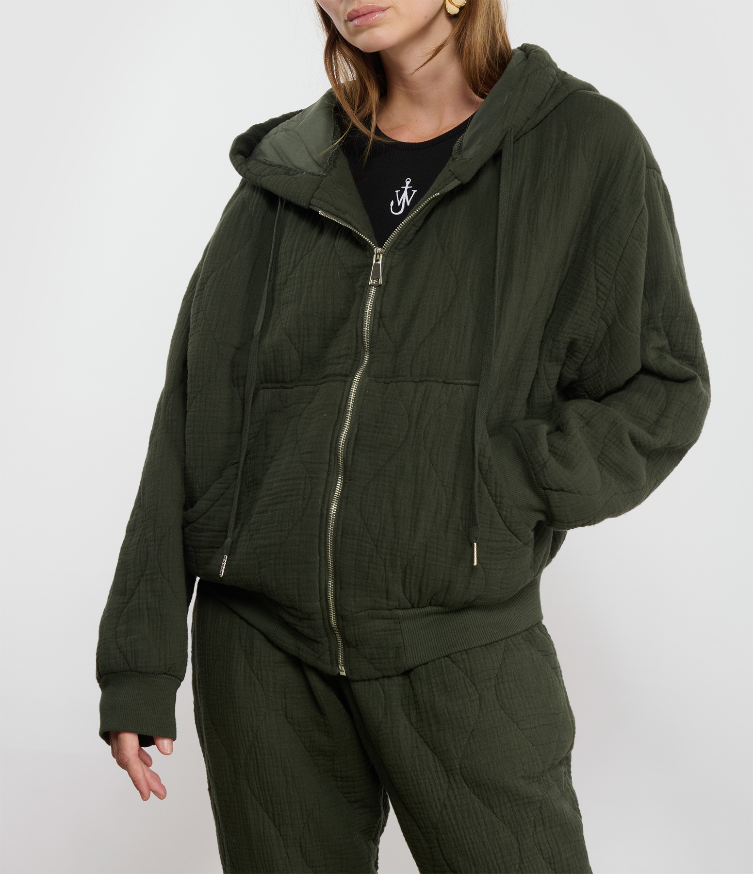 Veste d'inspiration hoodie en coton à surpiqures ton sur ton apparentes. Manches longues. Coupe droite. Capuche à cordon de serrage. Poches latérales plaquées. Base élastiquée.